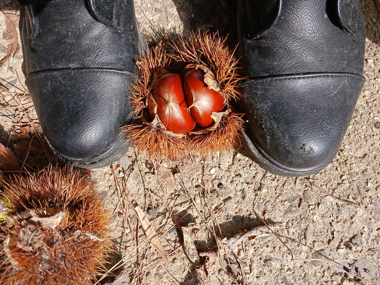 등산화와 워커 중 살짝 고민하다 워커를 신었는데 워커를 신고 오길 잘했습니다. 가시 가득한 밤송이를 두 발로 벌려주면 예쁜 밤이 뽀드득 얼굴을 내밉니다. 그럼 집게로 살짝 집어 가방에 쏙 넣습니다.