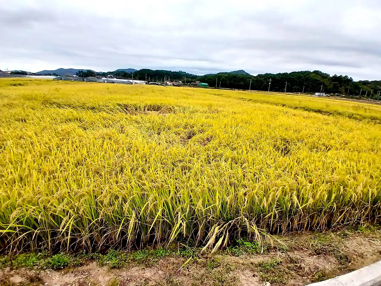 벼도 황금색으로 잘 익어갑니다. 잘 익어가는 논 사이에 쓰러져있는 벼들이 보입니다.