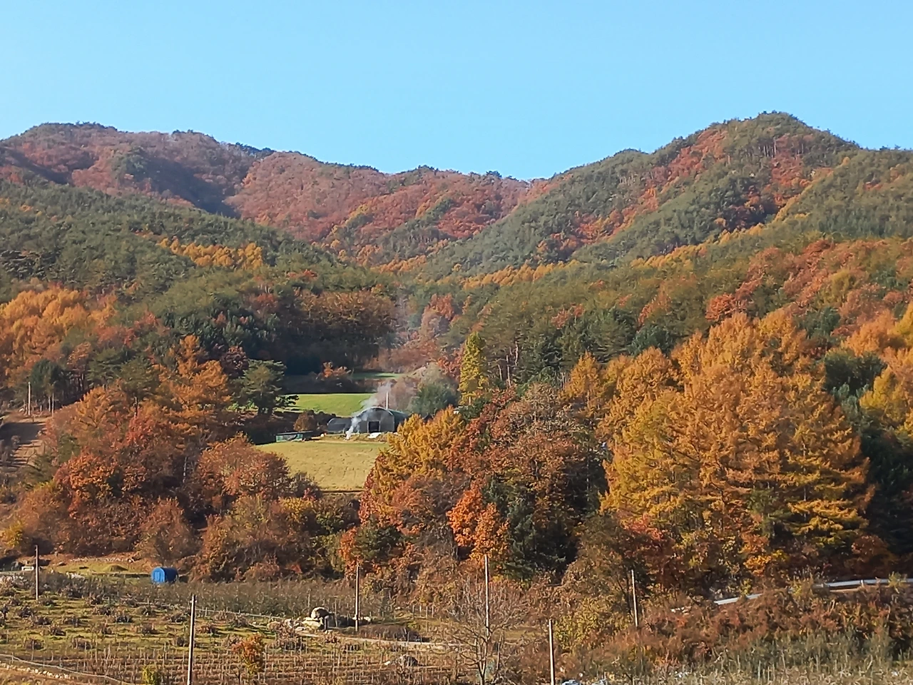 2박 3일 동안 시골에서 심심하지 않았냐고요? 출발하면서 영주의 아름다운 무섬마을과 부석사를 찍고 둘째 날 잔디밭에서 부모님은 축구를, 저는 책방에서 시간을 보내고 숙소에서 1시간 거리의 울진에서 죽변 스카이레일을, 분천역을 다녀왔습니다. 마지막 날은 백두대간 수목원, 과수원 사과 따기 체험까지 바쁜 일정이었습니다. 밤에는 보드게임을 했고요. 단체 위주의 관광을 주로 다니셨던 부모님은 색다른 여행이셨는지 매년 한 번은 이렇게 여행을 하자고 하셨어요. 물론 저도 정말 재미있었습니다. 숙소가 산 속이고 산을 넘어 여행을 하다 보니 올해 가을 단풍을 정말 원 없이 즐겼습니다.