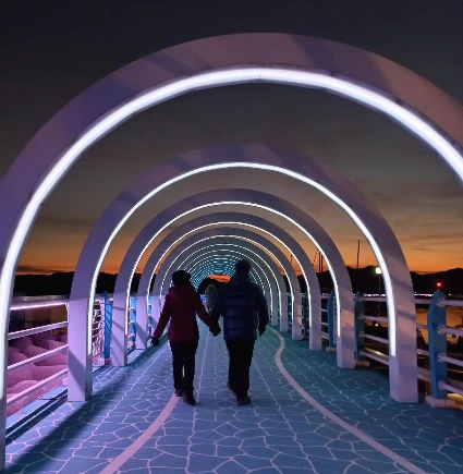 아담한 해수욕장에서 일몰을 넋 놓고 보고 있었습니다. 아름다움에 아무 생각이 들지 않았습니다. 모래사장으로 걸으며 바다에 손도 담그고 수줍게 치는 파도 소리도 듣습니다. 지는 해를 보면서 그 자리에 우뚝 서 있었는데 부모님은 춥다고 빨리 오라고 하시네요. 그렇지요. 겨울이었네요. 오랜만에 겨울바다를 보니 그저 행복합니다. 빨간 등대로 가는 산책 터널은 여러 색의 조명으로 자꾸 변신을 합니다. 앞서가신 부모님을 따라 걸어가 봅니다. 작년에 결혼 50주년을 보내신 부모님은 여전히 사이가 좋으십니다. 여전히? 뭐 초장기에는 잘 모르겠습니다. 제 기억에는 결혼 생활 50년 중 평균 40년은 좋으셨던 거 같고 지금은 더 좋아지신 것 같습니다. 나이가 드시면서 서로를 더 챙기십니다. 우리가 아주 어릴 때는 이동 수단이 자전거였는데 아빠가 엄마를 잘 태우고 다니셨습니다. 늘 손잡고 다니셨고요. 주변에서 자주 듣는 말이 있었다고 합니다.