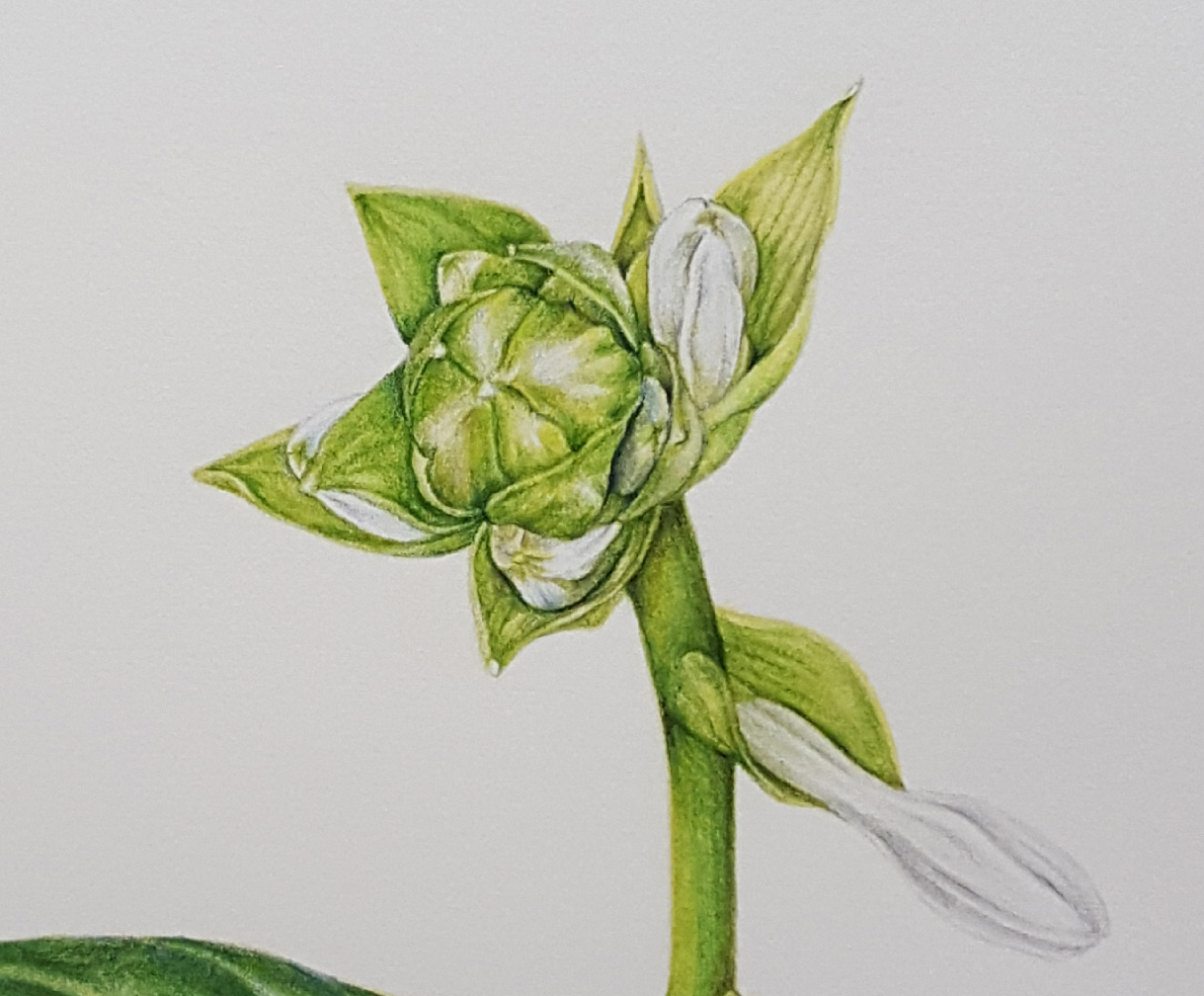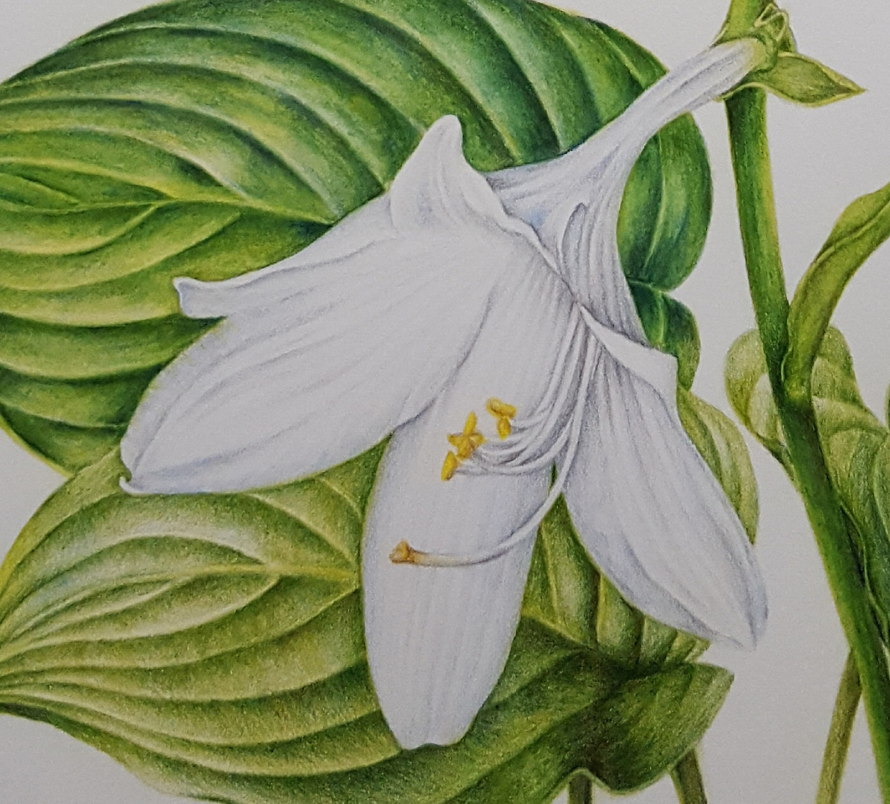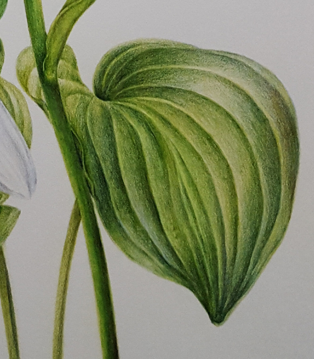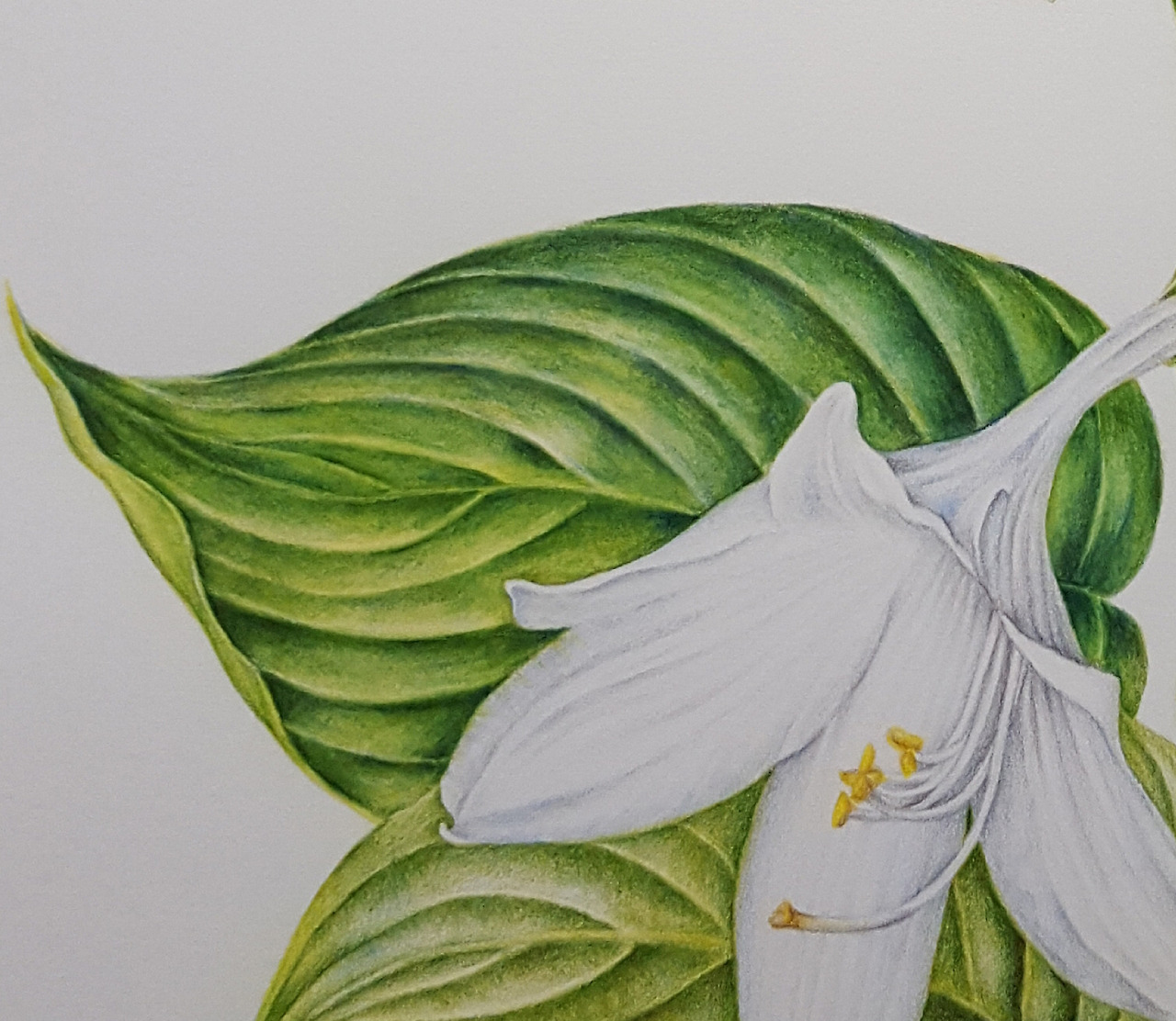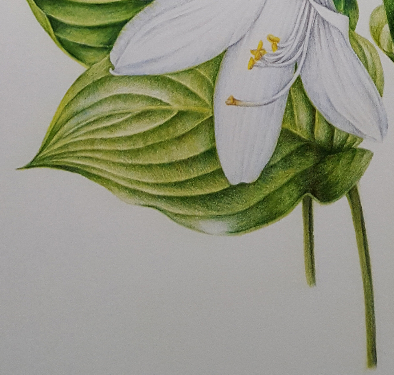 이번 옥잠화 작업에서는 새로운 시도를 해보았다. "작가되기#4 색연필 준비하기(2)"에서 보태니컬 아트(botanical art, 보타니컬 아트)에 사용하는 수성(수채) 색연필에 대해 설명하면서 색을 칠한 후 붓으로 물칠을 해서 수채화 같은 효과를 낼 수 있다고 장점을 언급했었는데 그 기법을 이용하여 그림의 일부를 그려보았다.