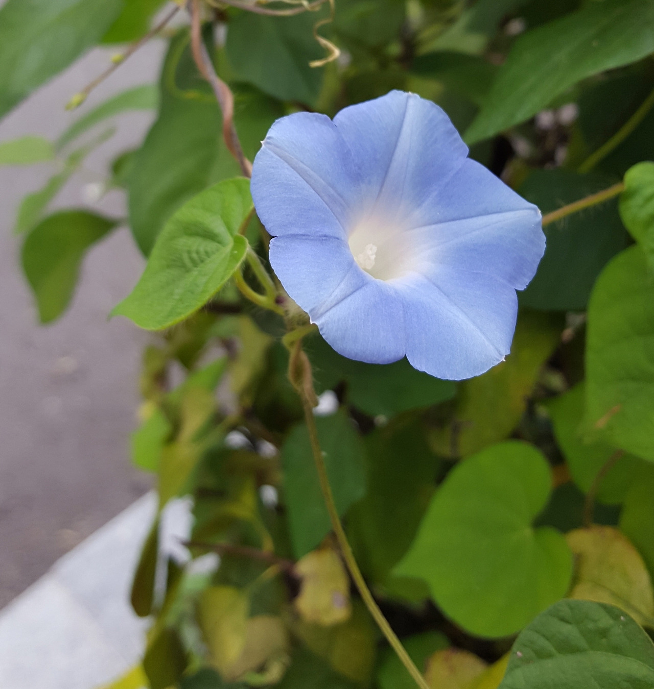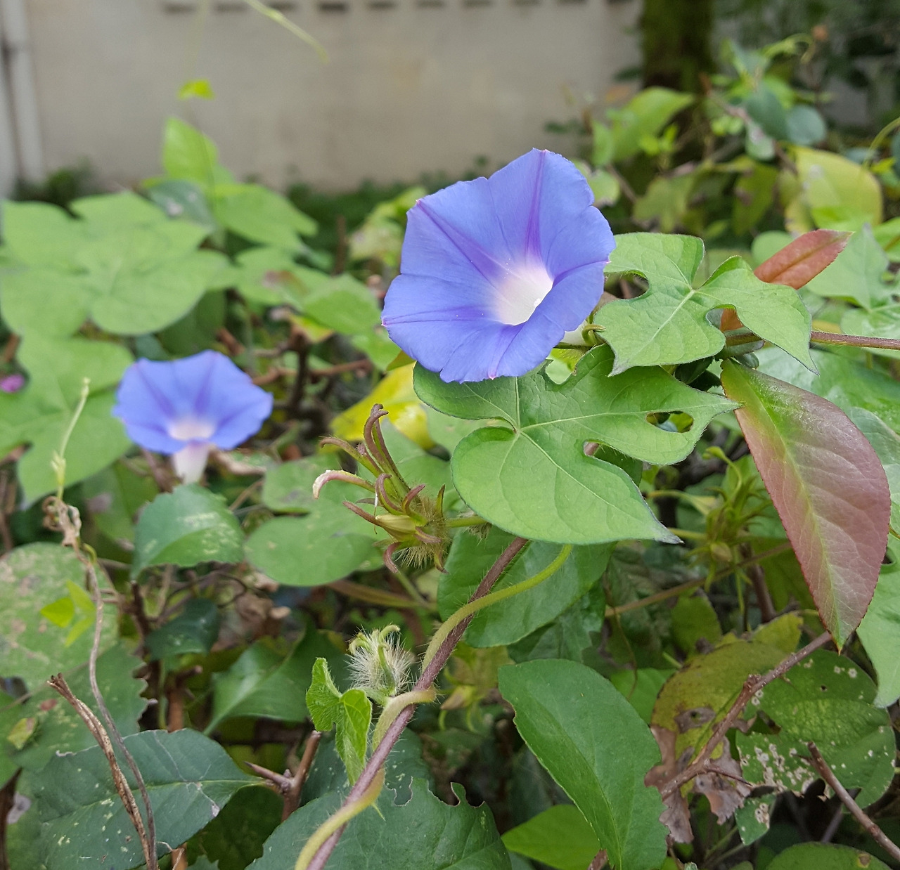 우리 동네에는 파란색 나팔꽃이 많이 피어있는데, 세 갈래로 갈라진 잎과 둥글게 하트 모양으로 생긴 잎, 이렇게 두 종류의 잎을 볼 수 있다.