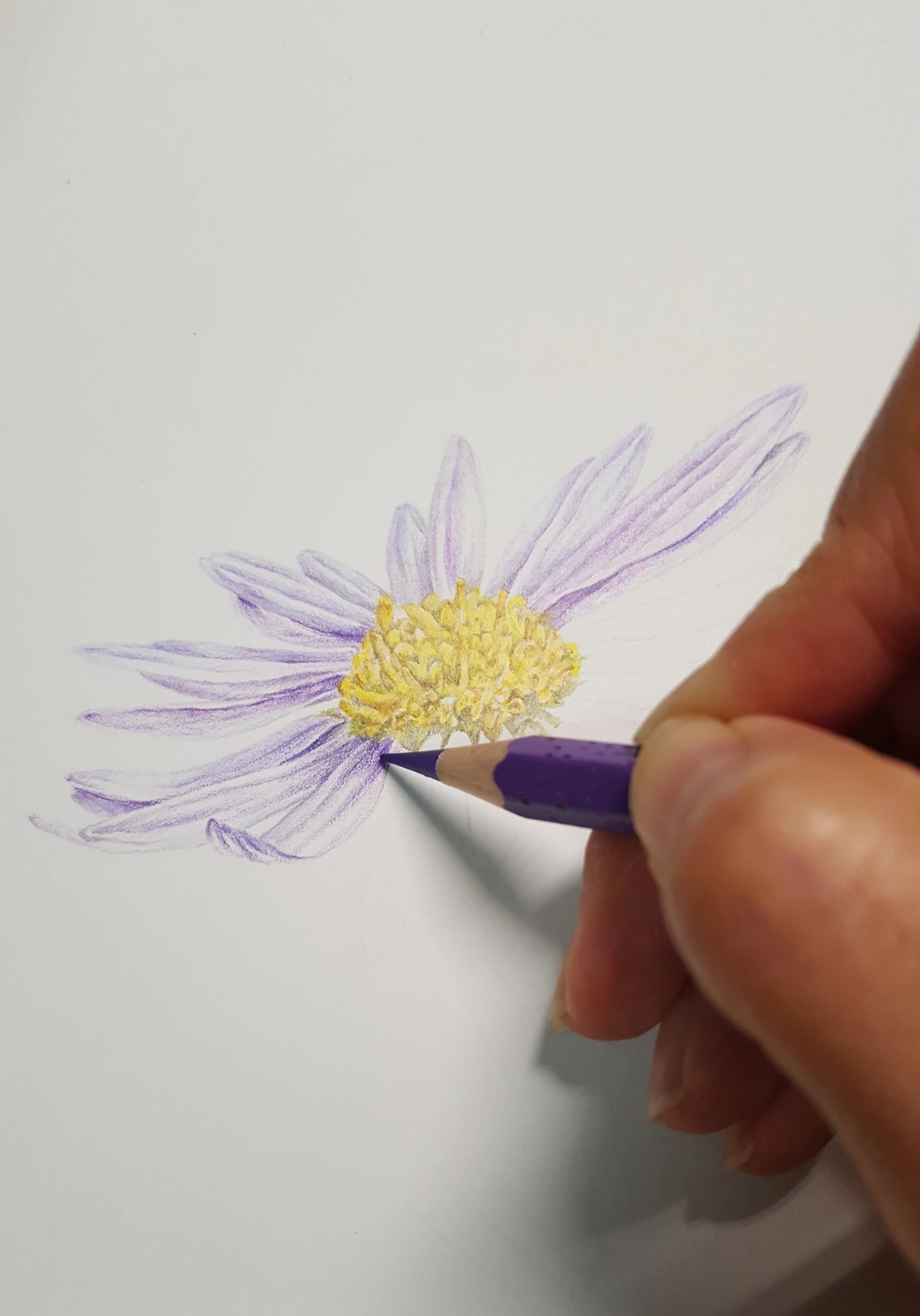 아래는 꽃잎 그리는 모습이다. 노란 암.수술을 먼저 채색하고 꽃잎을 하나하나 채색해간다. 처음에는 옅게 색을 올리고 이후에 계속 색을 쌓아 올려 나가며, 강조할 부분은 조금 더 진하게 색을 올린다.