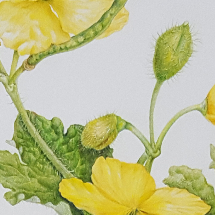 아래는 철펜을 사용하여 식물의 솜털을 표현한 예이다. 줄기와 꽃봉오리의 털은 아웃라인만 그려진 상태에서 ① 철펜으로 털 자국을 낸다. ② 털 자국 위에 색연필로 채색을 한다. ③ 채색이 안 된 털 자국 아래로 색연필로 그림자 표현을 하면서 아웃라인 밖으로 나오는 털도 자연스럽게 이어서 그린다.