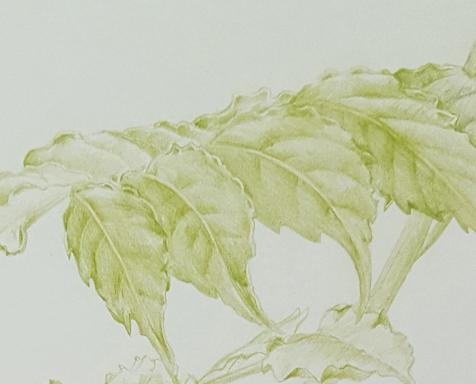 ① 잎맥 누르기 : 위에서 언급한 *잎맥용 색연필로 잎의 채색 전에 잎맥 아웃라인을 따라(흑연과 섞이면 지저분 하니 니더블 지우개로 누르면서 그리거나 흑연 아웃라인 살짝 옆으로 그리는 것도 방법이다.) 필압을 세게 하여 꾹 누르면서 선을 그린다. (※ 종이 아래에 신문지 등을 깔면 쿠션이 생겨서 필압의 표현이 더 잘 된다.)