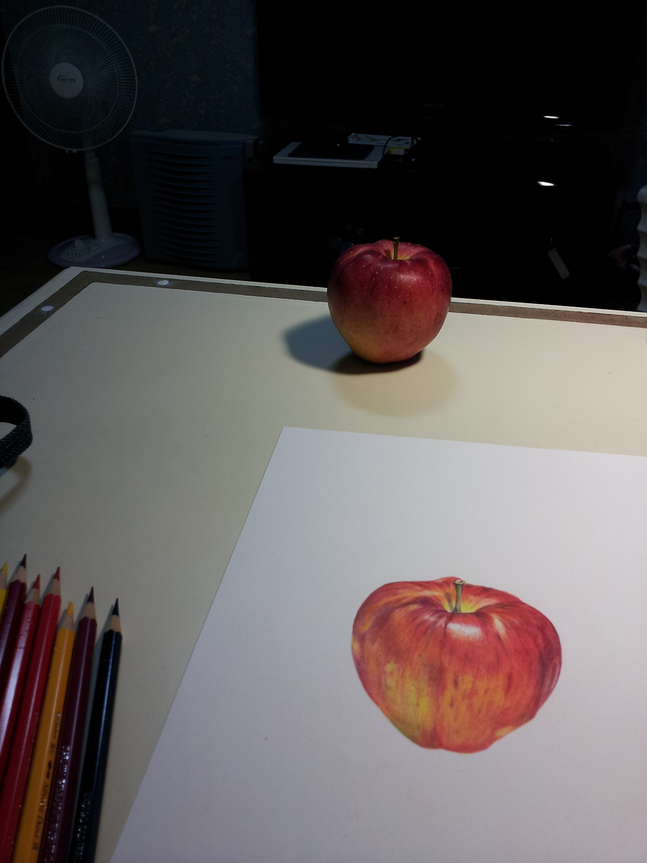 시장에서 사 온 사과가 너무 새빨갛고 탐스러워서 그려보고 싶은 욕구가 솟구쳤다. 시작한 지 얼마 안 되어서 모작만 겨우 몇 개 그린 상태였던 지라 실물을 보고 그려낼 수 있을지 거의 테스트에 가까운 작업이었다.