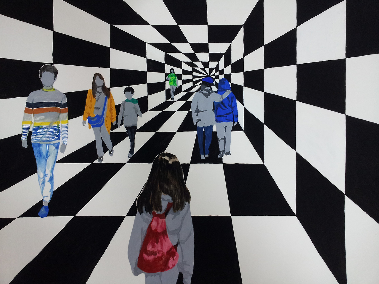 '통로' (by 까실, 종이에 과슈, 25.5 X 36cm, '아트페이퍼' 과목의 '옵티컬아트'를 주제로 한 과제)