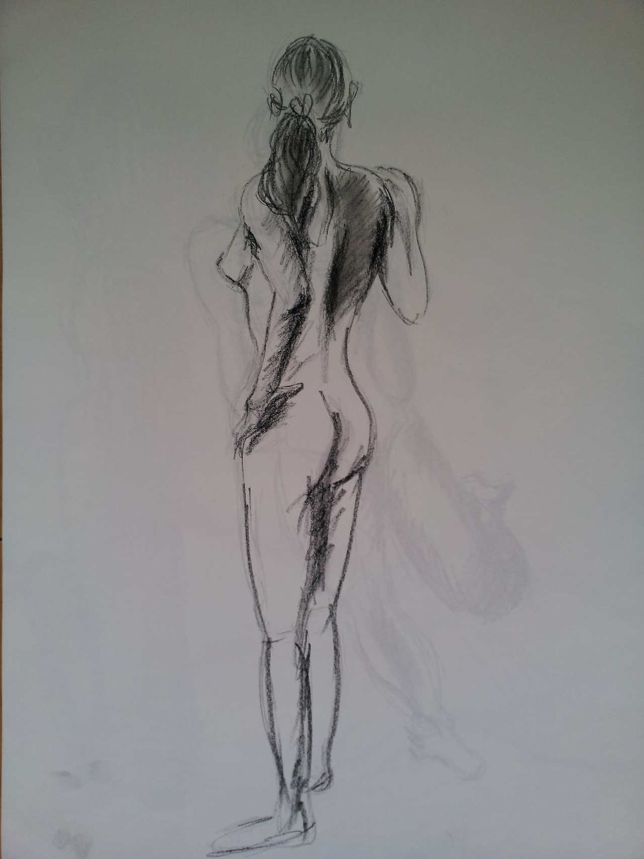 '인체 드로잉' 과목 오프수업에서 그린 누드 크로키(by 까실. 4절 크로키북에 목탄, 여러 포즈를 취하는 모델을 보며 1분, 5분, 10분 시간을 늘려가며 빠르게 그린다.)