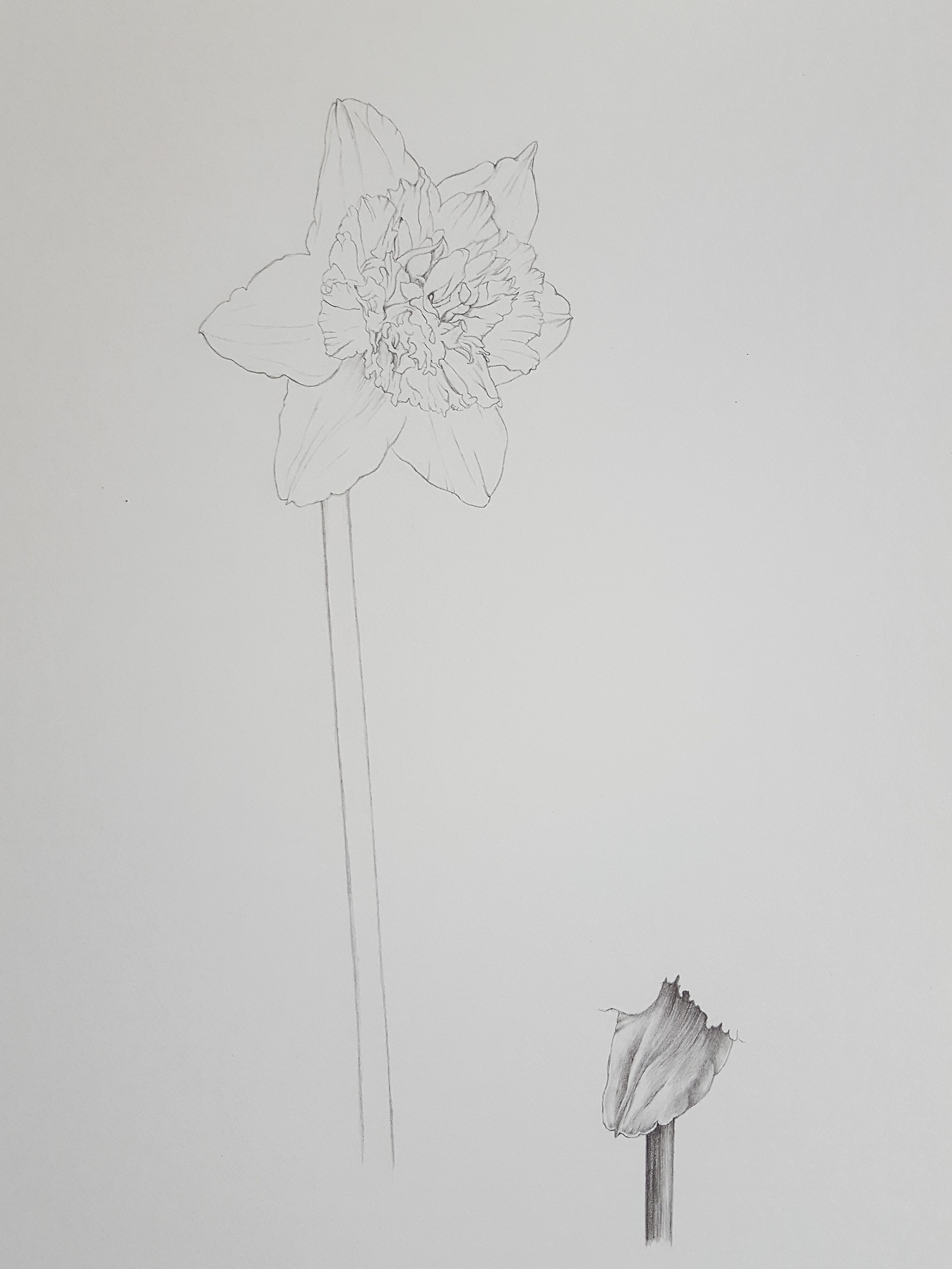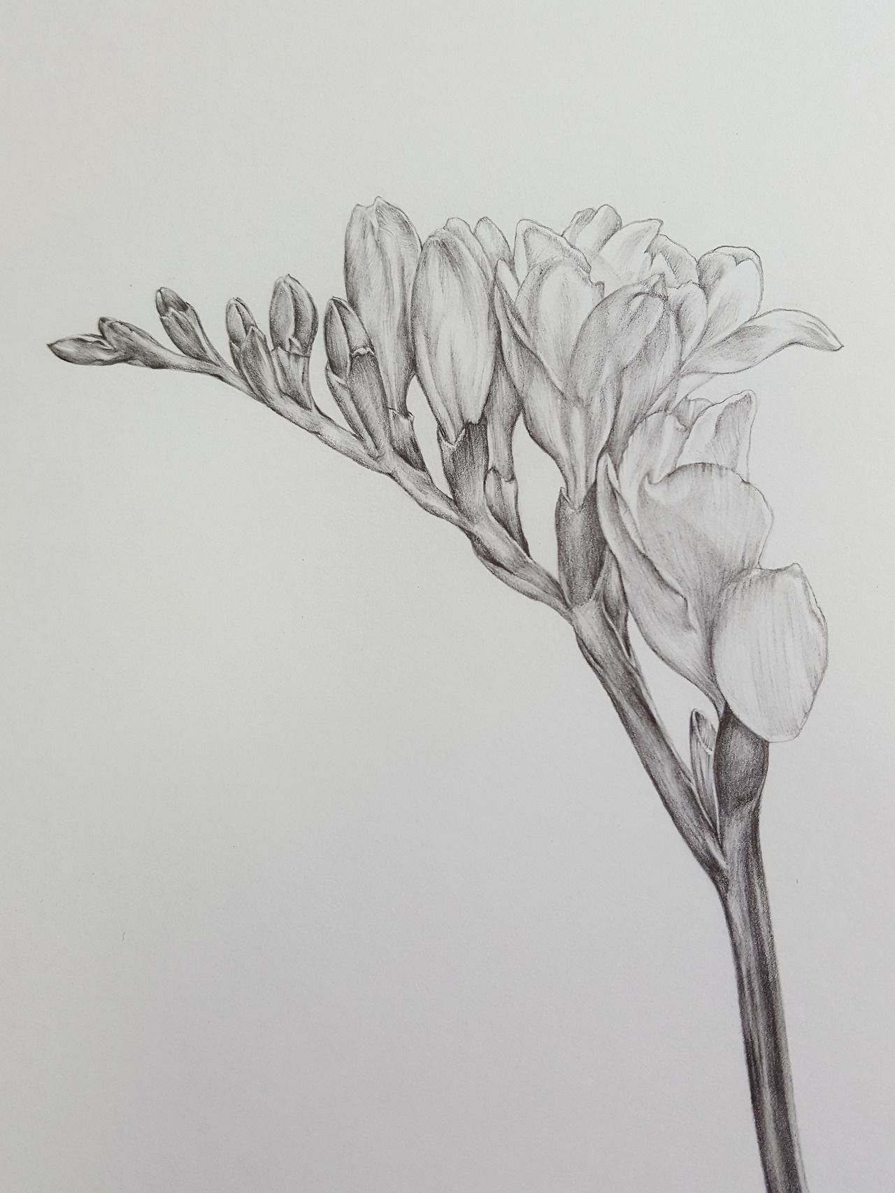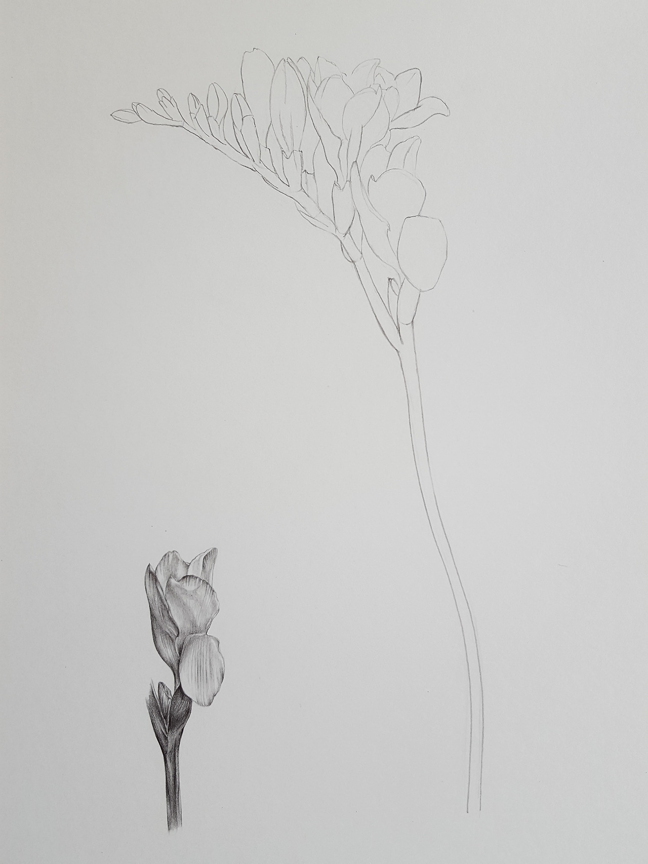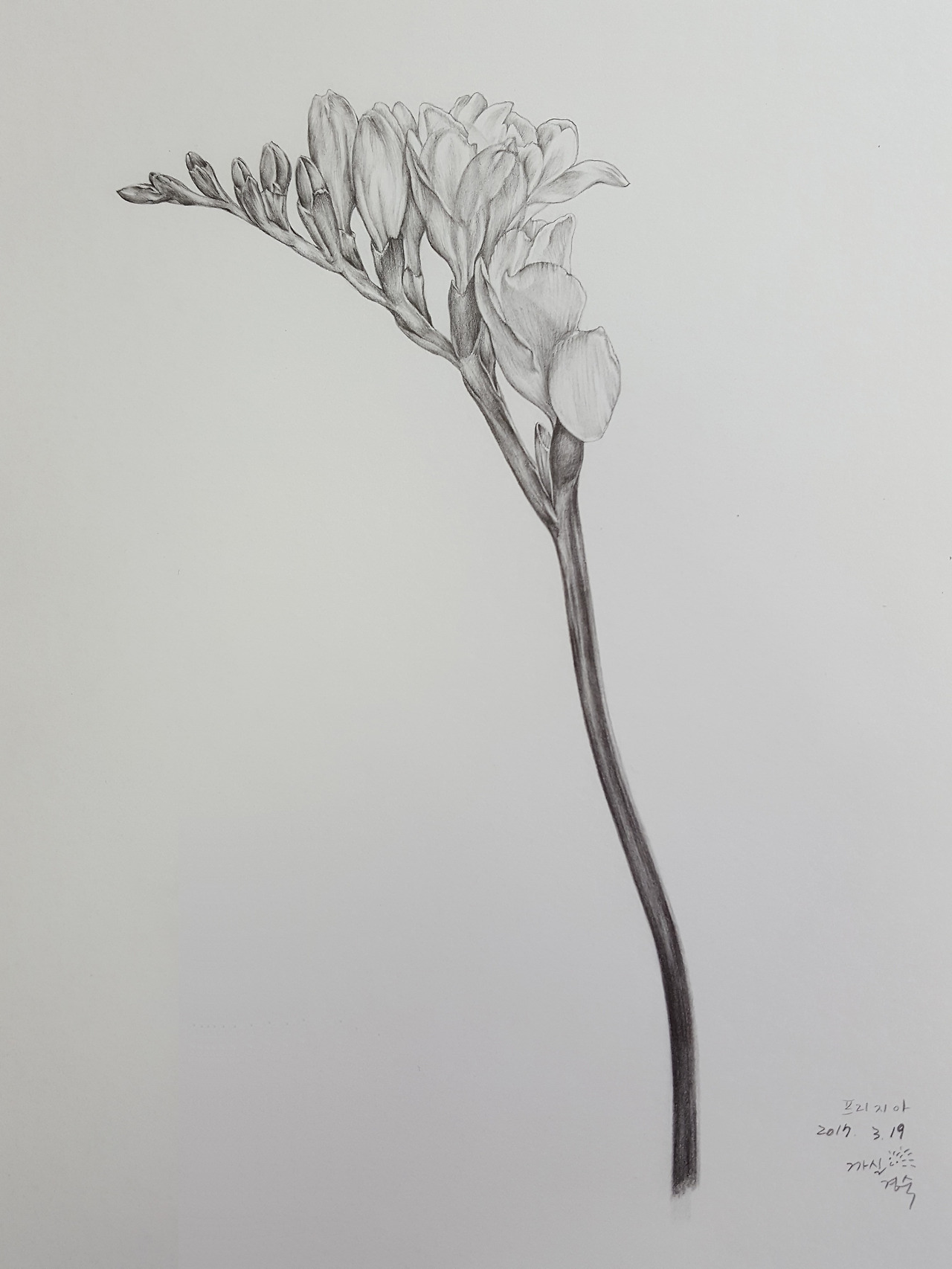 그 다음 주(3주 차)에는 선택한 하나의 꽃에 대해 미리 그려놓은 아웃라인 위에 연필(4H~4B)로 세부묘사를 하였는데 내가 선택한 프리지아의 세부묘사 그림은 이렇게 완성되었다.