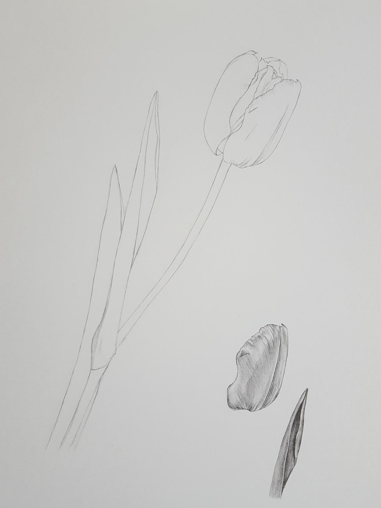 수업시간 동안에는 실제 꽃을 보고 그리지만, 그림을 완성하기까지는 시간이 오래 걸리고 꽃은 금방 시들기 때문에(또 빛의 방향도 계속 바뀌므로) 싱싱할 때 구도를 잘 잡아 사진을 찍어두는 것이 좋다. 꽃의 윤곽이 잘 드러나도록 하기 위해 꽃 뒤에 흰 종이를 배경으로 하여 사진을 찍으면 나중에 좀 더 수월하게 그릴 수 있다.
