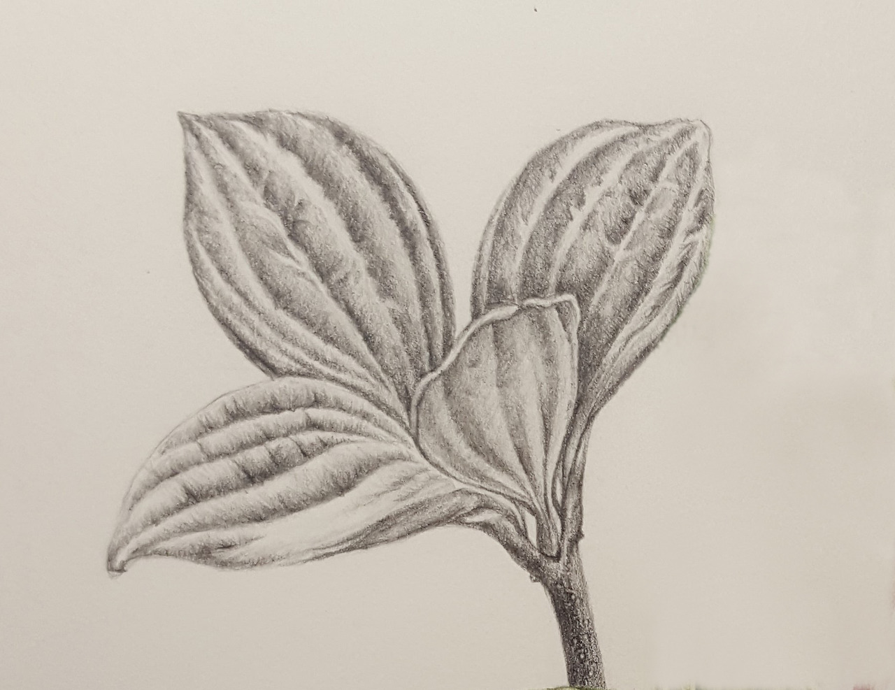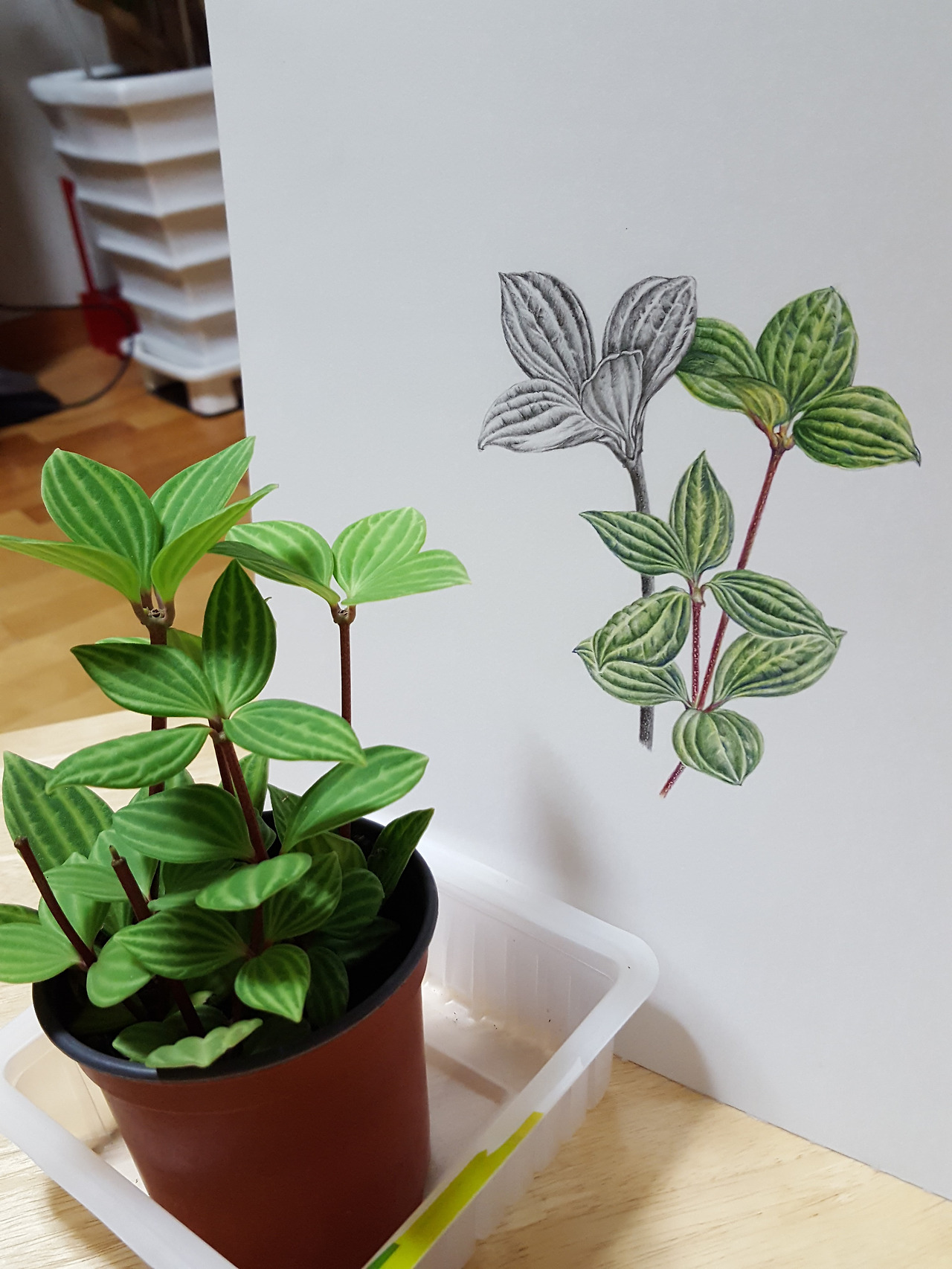 우선은 색연필로 바로 들어가지 않고 화초를 관찰하고 특성을 파악하기 위해 연필 묘사부터 해보는 시간을 가졌다. 이렇게 먼저 대상 식물과 친해지고 난 후에 작품을 시작하는 것도 좋은 방법인 것 같다.