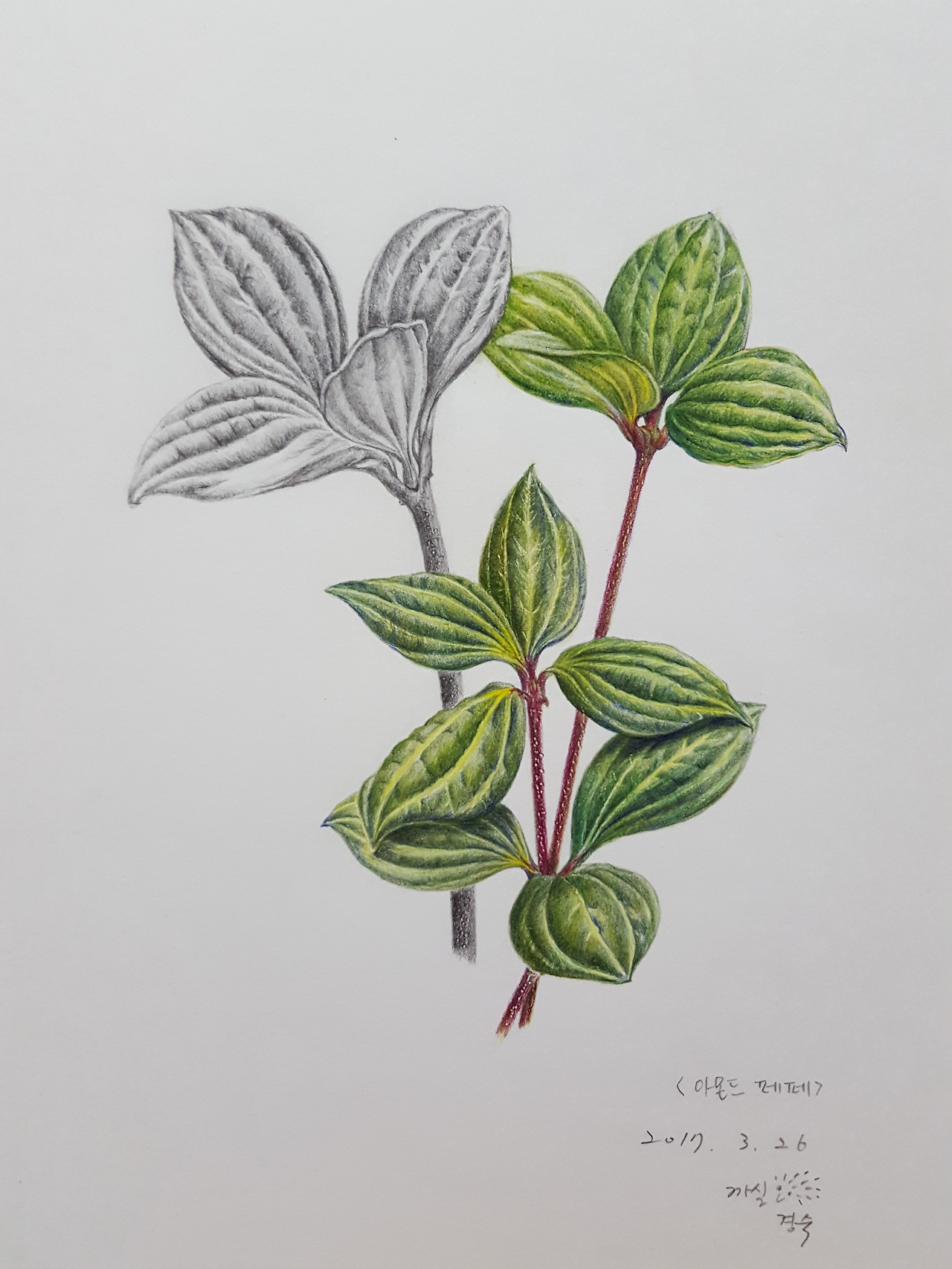 사실, 그 당시 아몬드페페는 딱딱한 잎을 가졌기 때문에 금방 시들지 않을 거라는 생각에 사진을 찍지 않고 바로 구성을 하고 채색을 했는데 집에 와서 사진을 찍어놓지 않은 것을 많이 후회했었다. 집에 와서 마저 그리려니 빛의 세기와 방향이 달라 잎의 색이 다르게 보일 뿐만 아니라 음영 표현도 쉽지 않아서 고생을 했다.