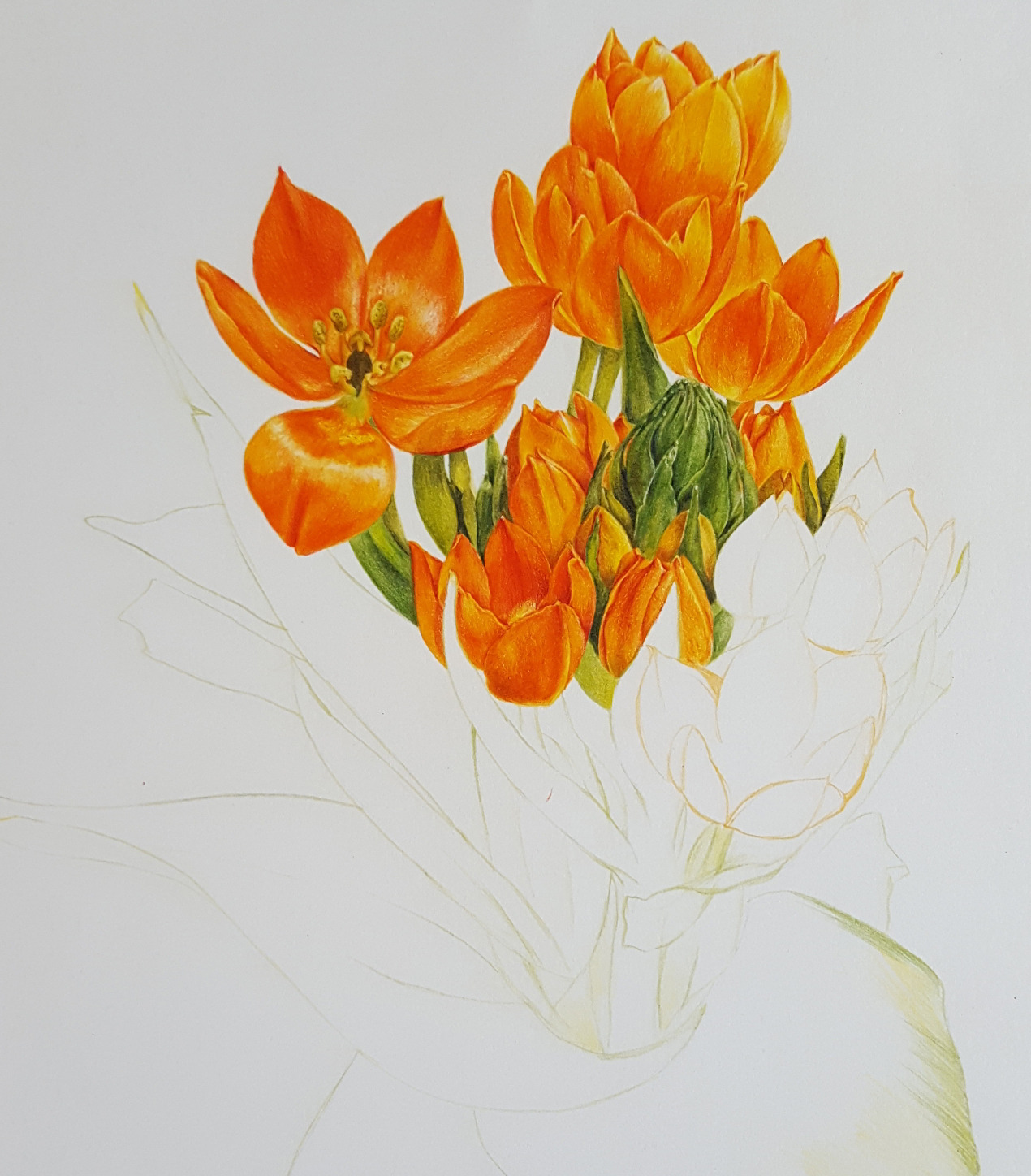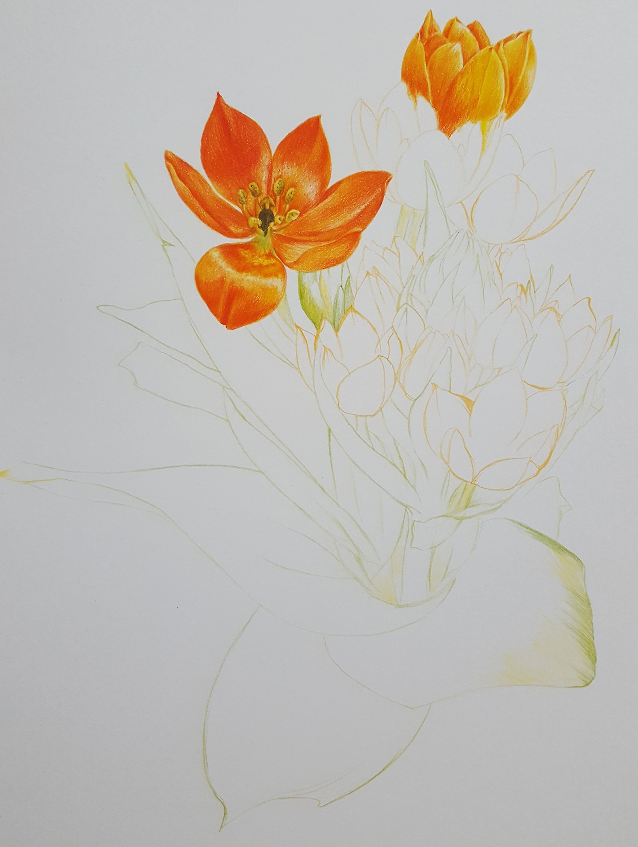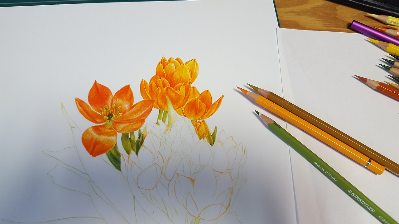 사실, 커리큘럼 상 꽃 한 송이 그리기는 한 주였고, 그다음 수업은 과일 등 열매를 그리는 수업, 그리고 그 이후 수업이 꽃과 줄기, 잎, 뿌리 등을 포함하는 보태니컬 아트 작품을 완성하는 거였는데 나는 이미 그려놓은 오니소갈룸 꽃 한 송이 그림 위에 추가하여 작품을 완성했다.