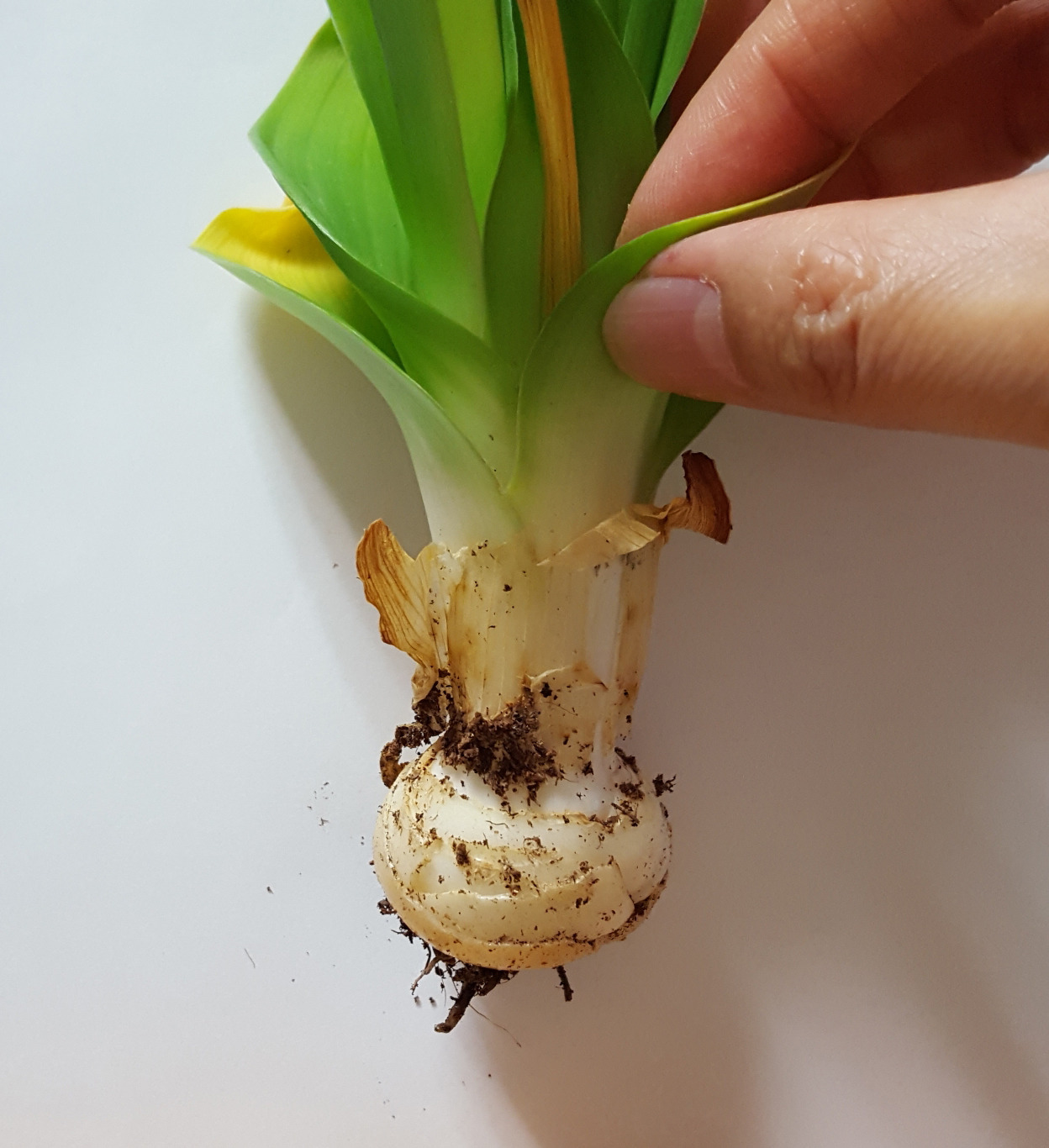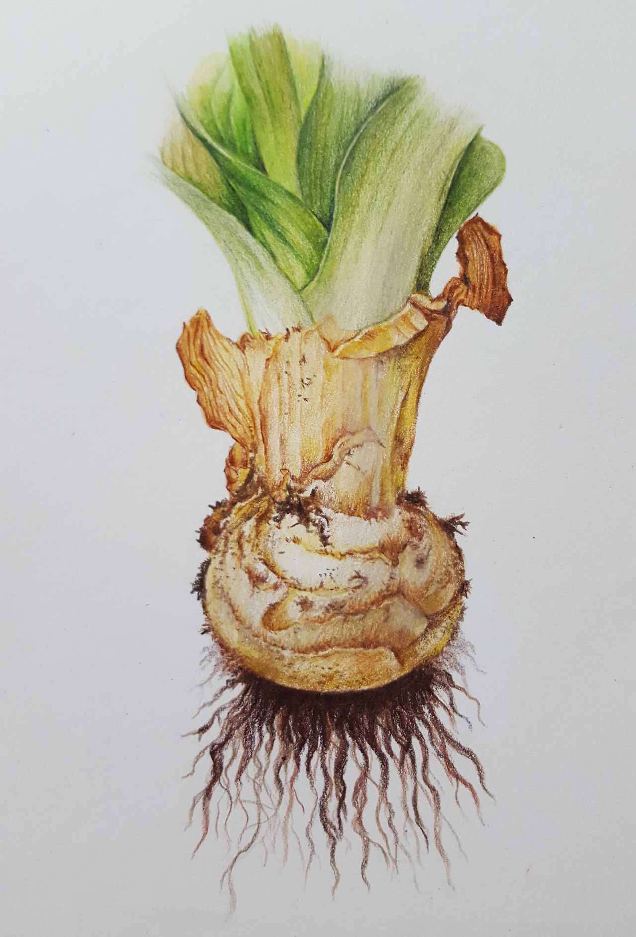 구근까지 다 그려 넣어서 이렇게 작품이 완성되었다. 구근을 왼쪽 옆에 따로 그려 넣은 이유는 그림 상에서 잎 부분이 너무 넓어서 뿌리가 가려져서 안 보이는 구조이기 때문이다. 보태니컬아트 작품에는 뿌리나 열매 등을 이렇게 따로 그려 넣는 경우가 많기 때문에 부자연스러운 것은 아니다.