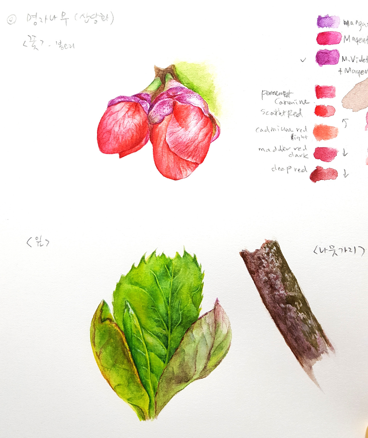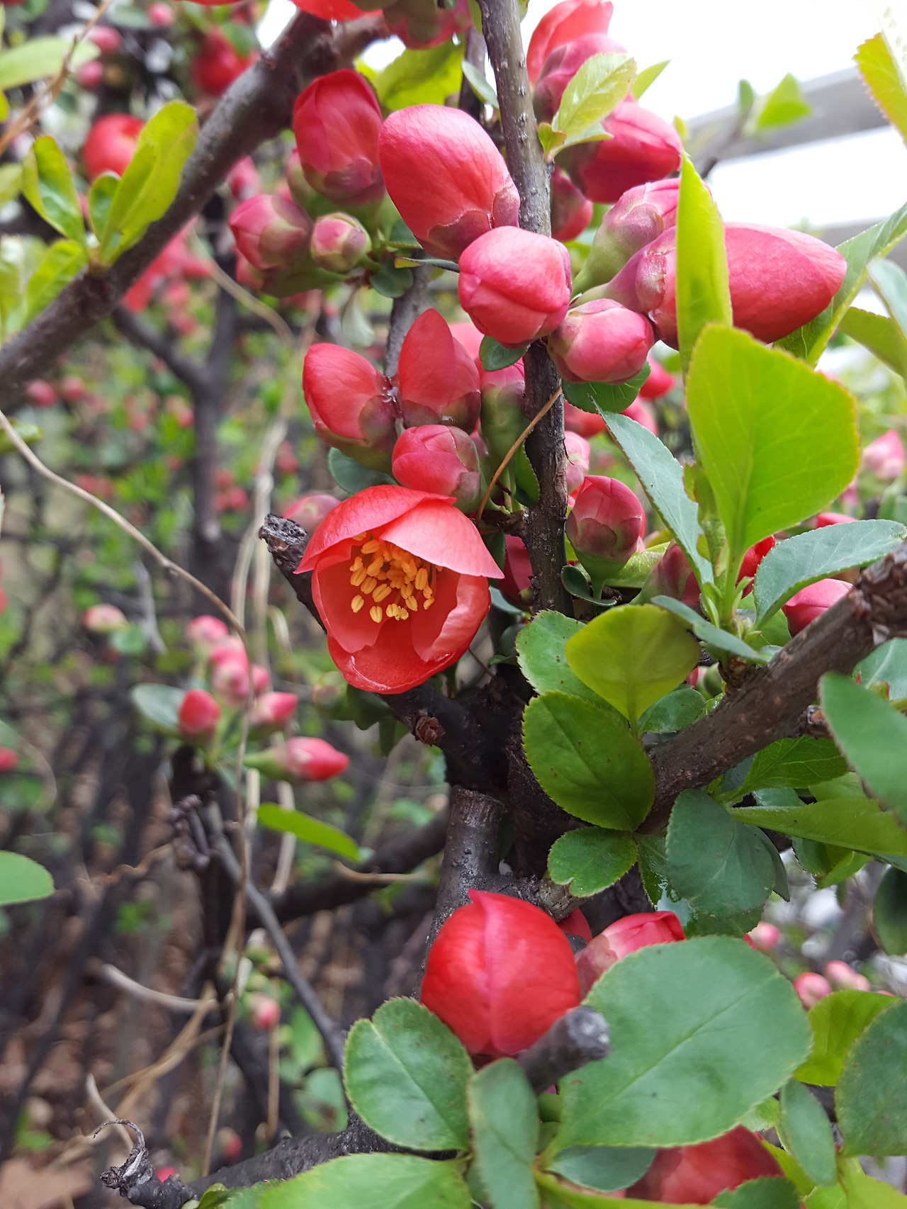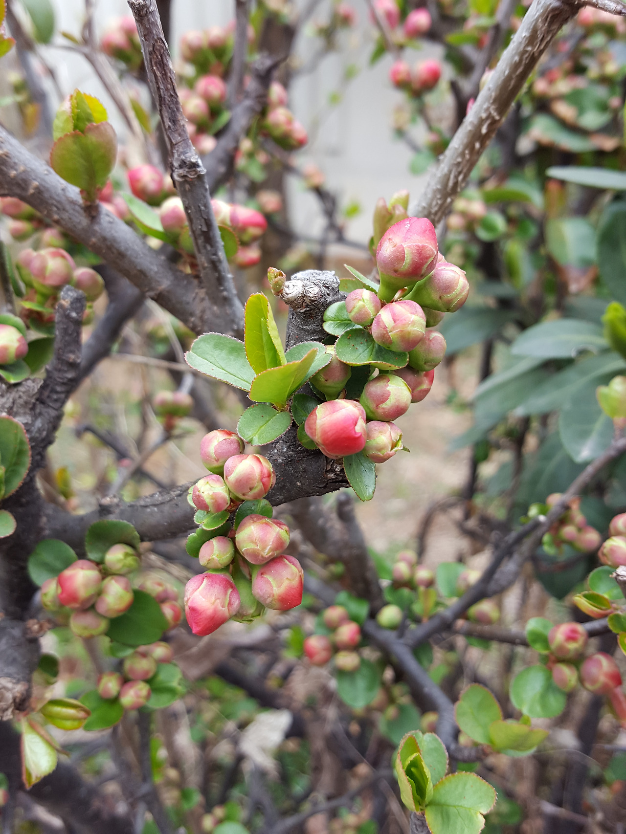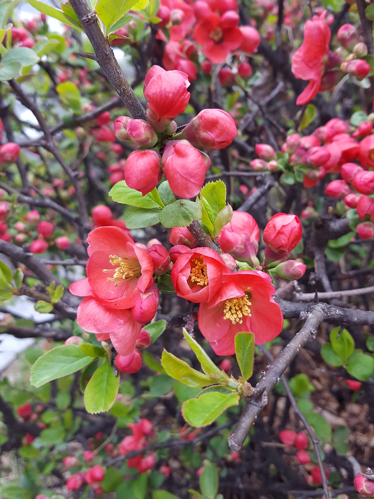 동네꽃#11 명자나무.. 붉은 봄꽃에 반하다 동백꽃을 닮은 매혹적인 붉은 꽃나무 | 매화, 목련, 개나리, 진달래, 벚꽃 등 잎보다 꽃을 먼저 피워 봄을 알리는 대표적인 봄꽃들이 거의 지는 요즘이다. 이때 등장하여 짠~ 하고 붉은빛을 뽐내는 꽃이 명자나무다. 명자나무 꽃은 언뜻 보면 동백나무 꽃과 비슷하게 생겼는데, 꽃이 동백보다 작고 잎은 얇고 연한 녹색으로 동백나무처럼 광택 나는 잎이 아니다. 좀 더 정확히 하자면, 명자나무 속 식물에