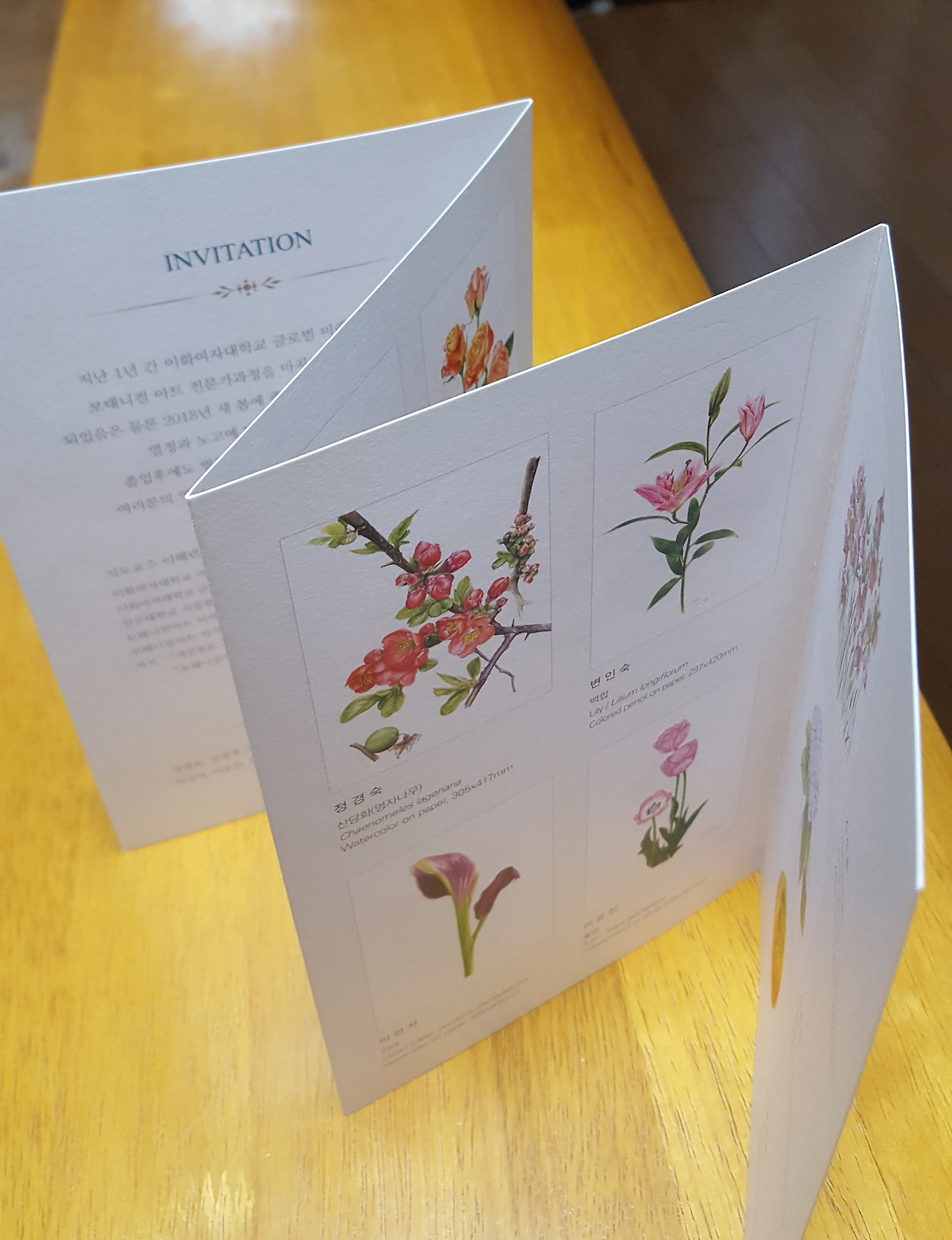 그런데 그 1년 후가 바로 지금인 것이다. 우리는 2018년 2월 28일부터 3월 6일까지 인사동 경인미술관 제2전시실에서 드디어 전시회를 열었고 성공적으로 마쳤다. 여러 작품이 판매 제의를 받았고 1,000부를 발행한 리플릿은 소진되었으며 대부분의 작품 엽서(1장당 1천 원에 판매/답례 용도로 제작함)도 예상과는 달리 대부분 매진되었으니 성공적이라 자신 있게 말할 수 있을 것 같다.