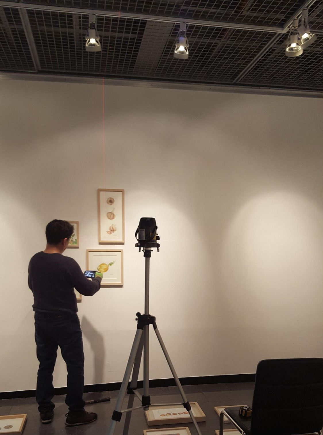 작품 배치가 결정된 후에는 전문가분이 오셔서 레이저 장치로 수평을 맞춰가면서 못질을 하고 작품 액자를 걸어주셨다. (액자를 거는 방법은 전시관에 사전에 확인하고 진행하는 것이 좋다.) 액자를 다 걸고 나면 전시관 조명 담당자분이 오셔서 각 작품마다 조명이 제대로 포커싱 되도록 조명 설치를 한다.