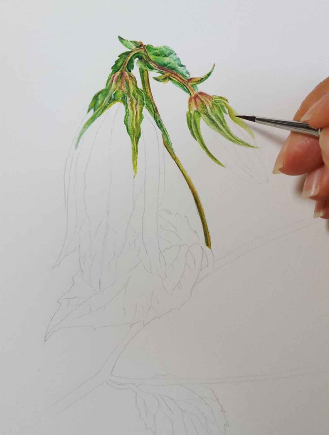 필자의 사진 폴더를 보면 초롱꽃은 2012년도부터 등장하는데 그때는 필자가 막 보태니컬 아트를 시작하던 때라, 동네에서 이 꽃을 처음 보고는 너무 그리고 싶었고 그 이후로 볼 때마다 매년 많은 사진을 찍어놓았었다. 그리고 그 소망을 지금 이루게 된 것이다.