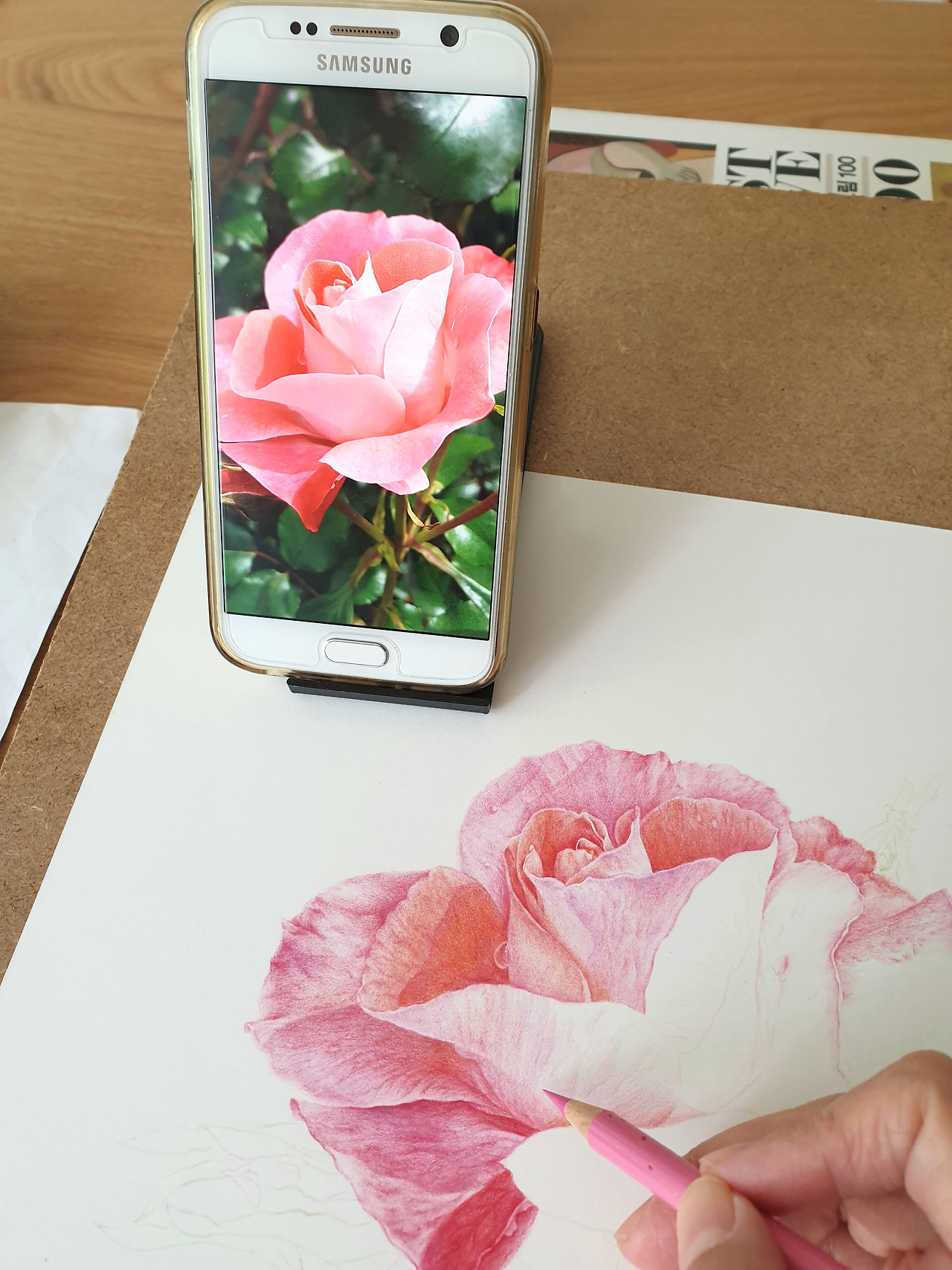 이렇게 나의 열악한 작업 환경이 드러난다. 모니터도 아니고 태블릿 PC도 아닌 자그마한 휴대폰에 담긴 사진을 손가락으로 화면 확대를 해가며 작업하는.. (이젤을 쓰지 않고 두꺼운 책을 화판 위쪽 밑에 받쳐놓아 약간의 경사를 만들어놓고 작업을 한다. 내가 좋아하는 경사를 책을 쌓아서 만든다.)