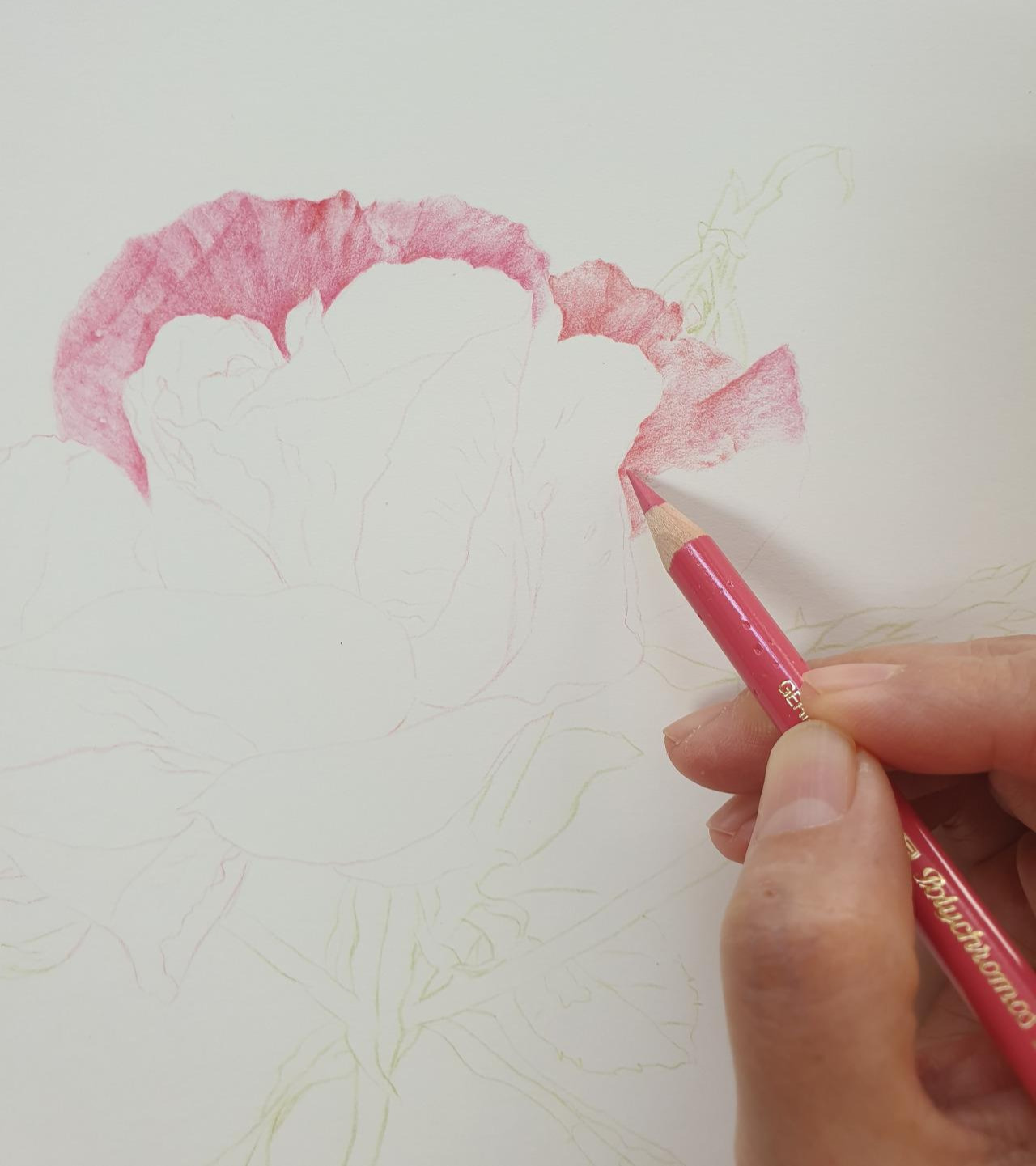 이 글의 제목답게 무화과에 이어 '더 세밀하게 그리기'위해 꽃잎의 맥 하나하나 보이는 대로 모두 그리려고 노력했다. 꽃잎맥까지 스케치하는 것은 힘들어서 아래와 같이 아웃라인만 스케치한 후 꽃잎맥을 찾아가면서 채색을 했다.