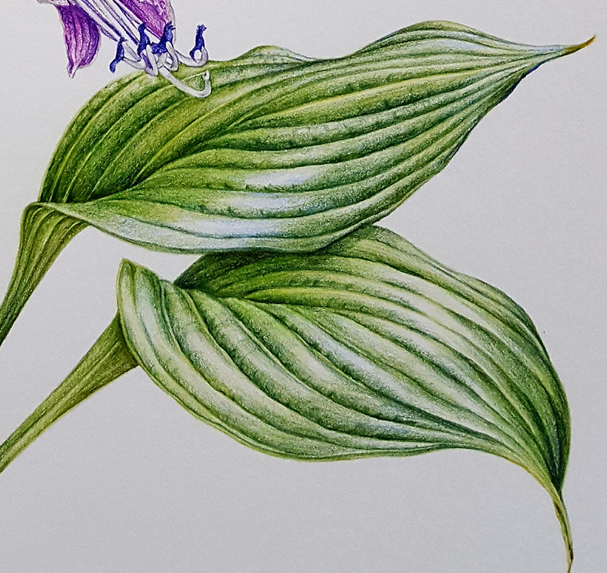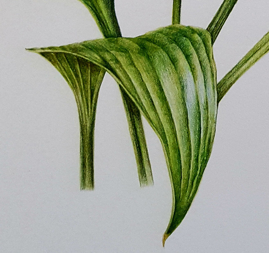 이번 그림에서도 잎의 광택을 표현하기 위해 신경을 많이 썼는데 광택(빛) 표현은 그린 계열 색을 칠할 때 그 부분을 비워두고 칠한 후 위로 색연필이 스쳐가듯이 살짝 칠해 주거나 흰 공간 양쪽에서 약해지는 가는 선들이 만날 듯 말듯하게 그려주면 된다. 아주 희게 보이지 않고 푸르스름하게 보이는 경우도 많으니 그럴 때에는 그 위에 푸른 계열 색을 살짝 올려준다.(예를 들면, 파버카스텔 sky bule(146번))