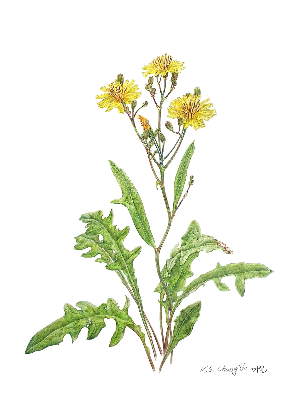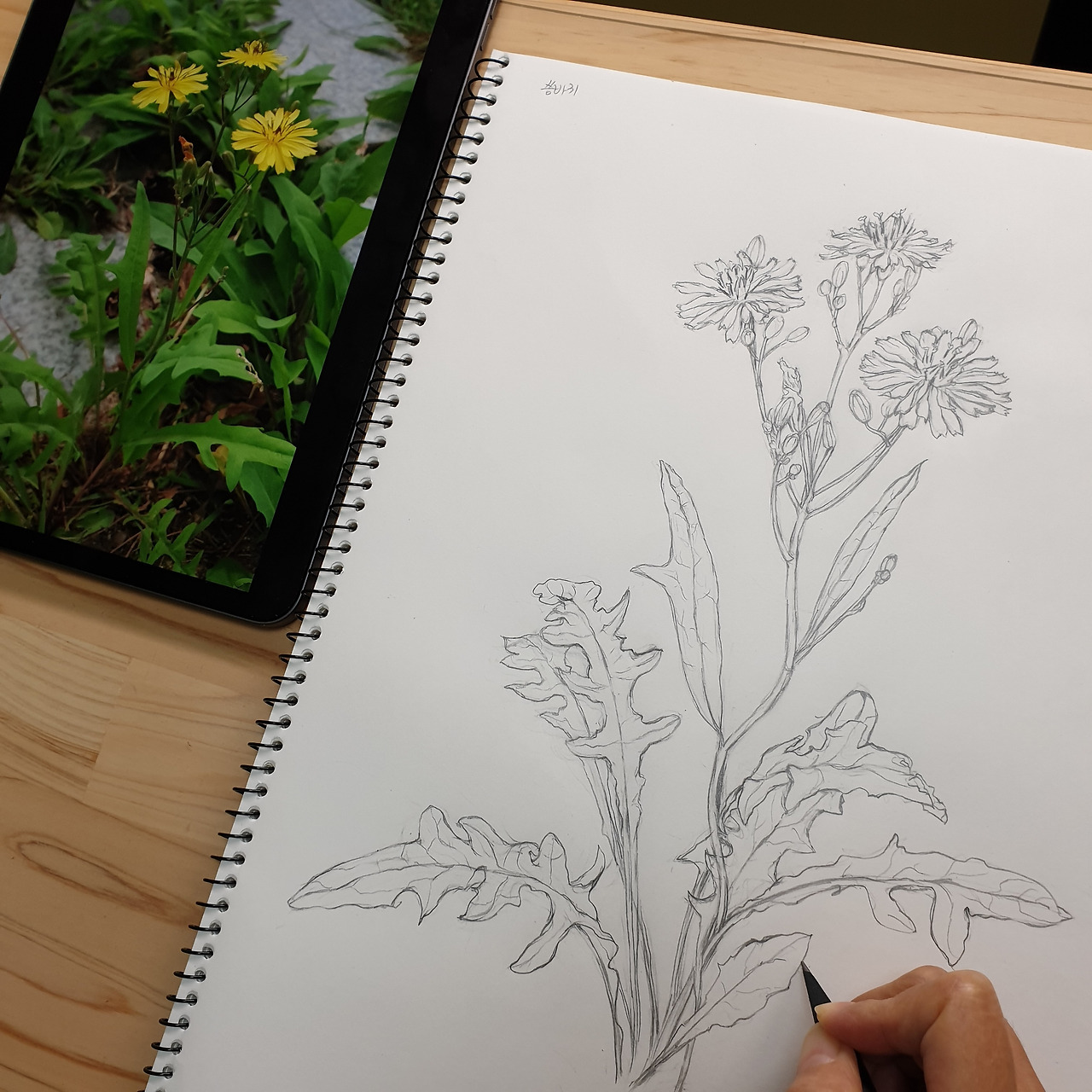 이렇게 반찬으로 먹는 씀바귀가 동네에서 쉽게 볼 수 있는 식물이었다는 사실을 안 건 그림을 그리면서부터다. 초록의 잎보다는 꽃이 눈에 잘 띄기 때문에 길가에 피어있는 꽃을 보면 눈길이 가고 모르는 꽃이면 찾아보는 게 일상이 되었다. 그 덕에 씀바귀 꽃도 알게 되었다.