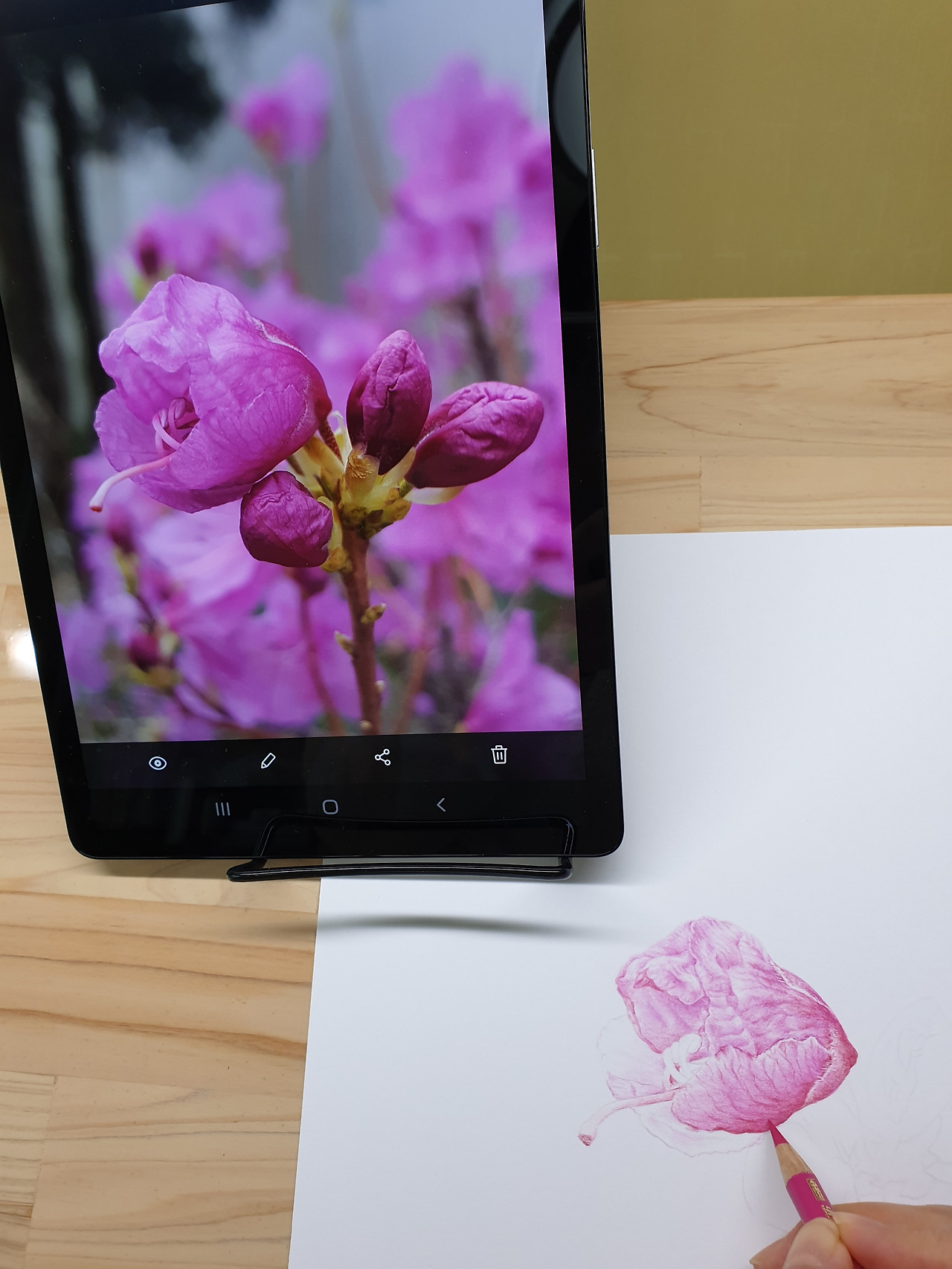 사진을 보면서 진달래 꽃을 그리고 있는 모습