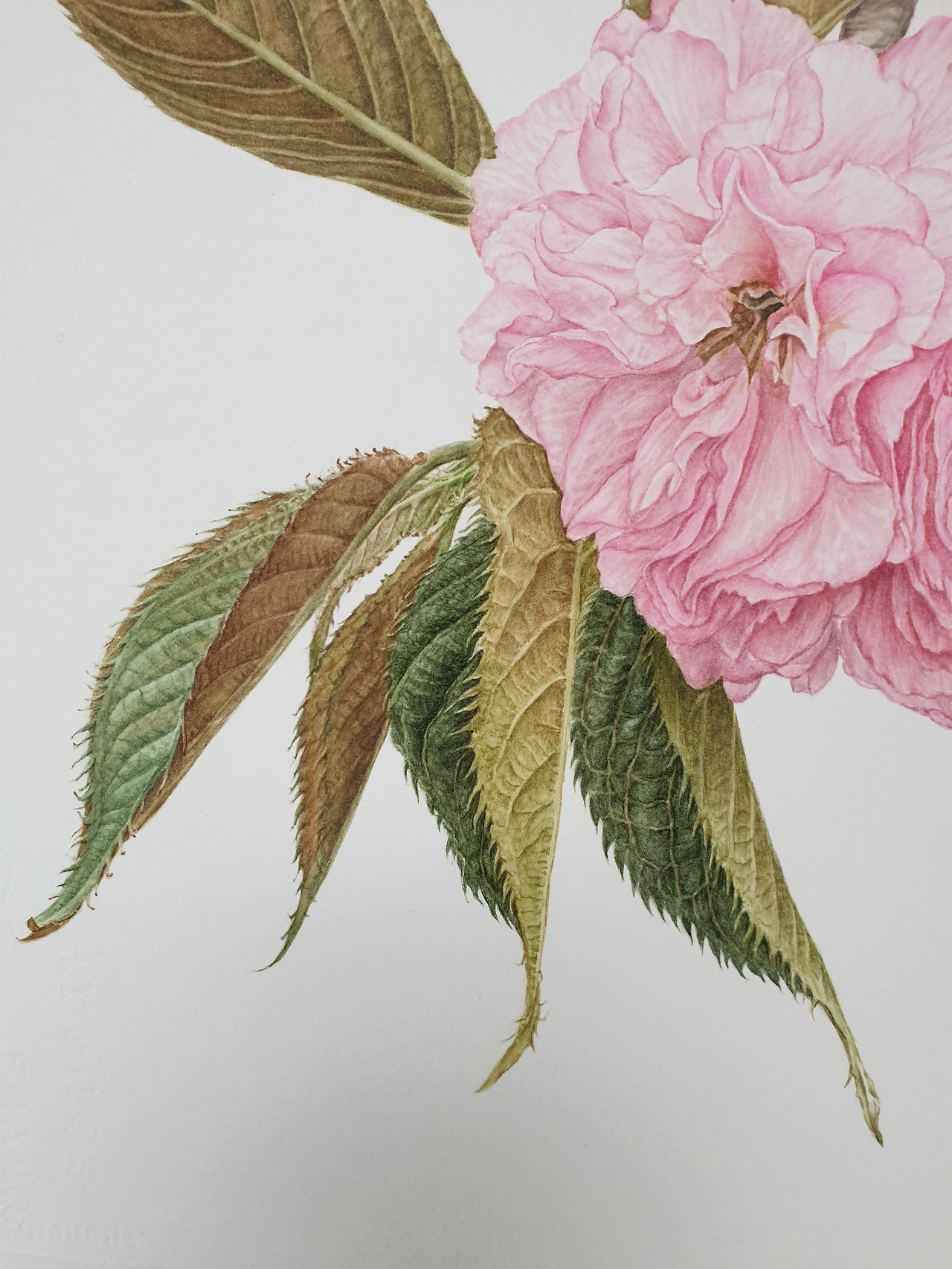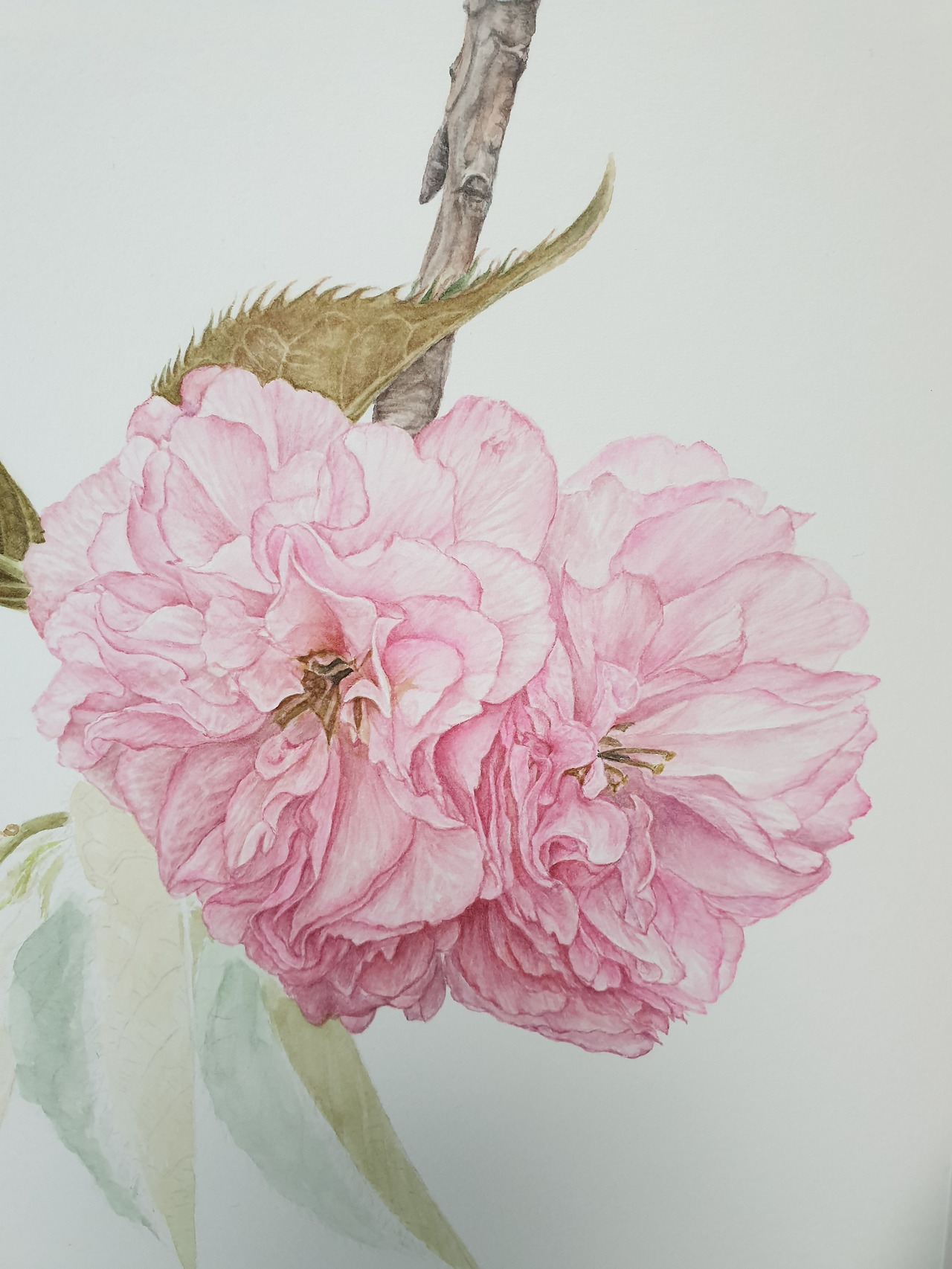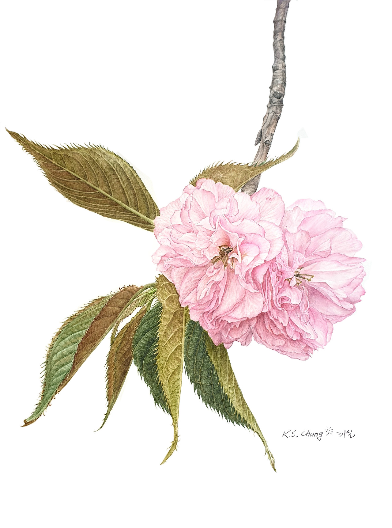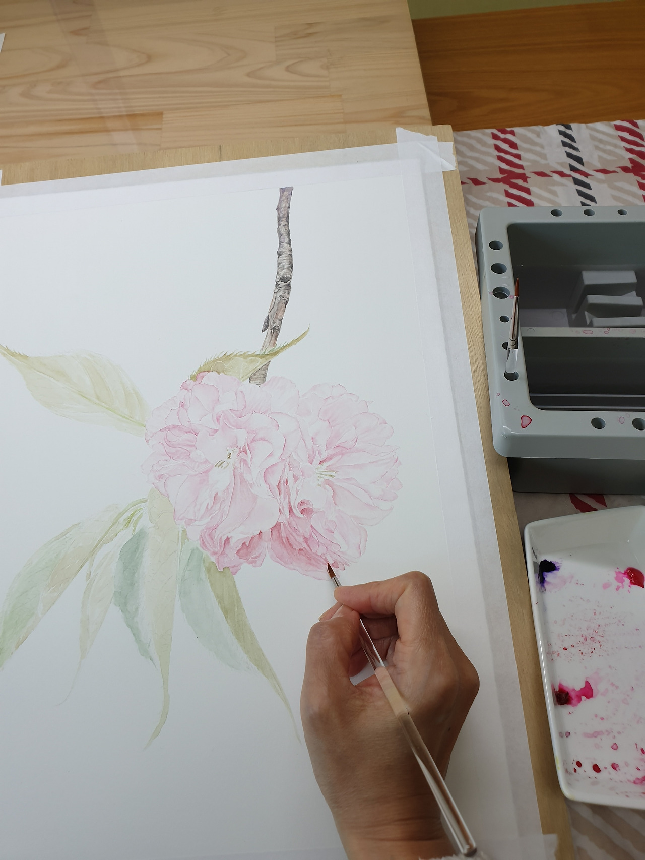 그리고 1년을 기다려 올해, 겹벚꽃이 활짝 피는 시기에 맞춰 그림을 완성하기 위해 앞서 그린 '현호색'을 완성하자마자 준비에 들어갔다. 그러니까 이 그림은 1년 전부터 '계획이 다 있었던' 그림인 것이다. 하하하