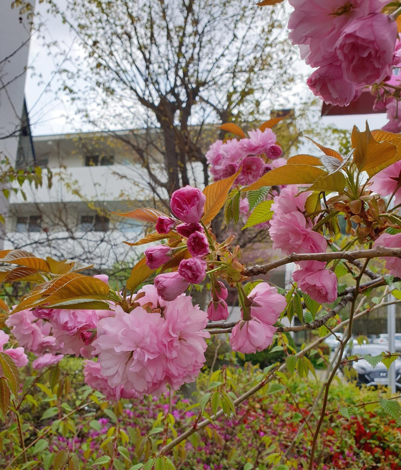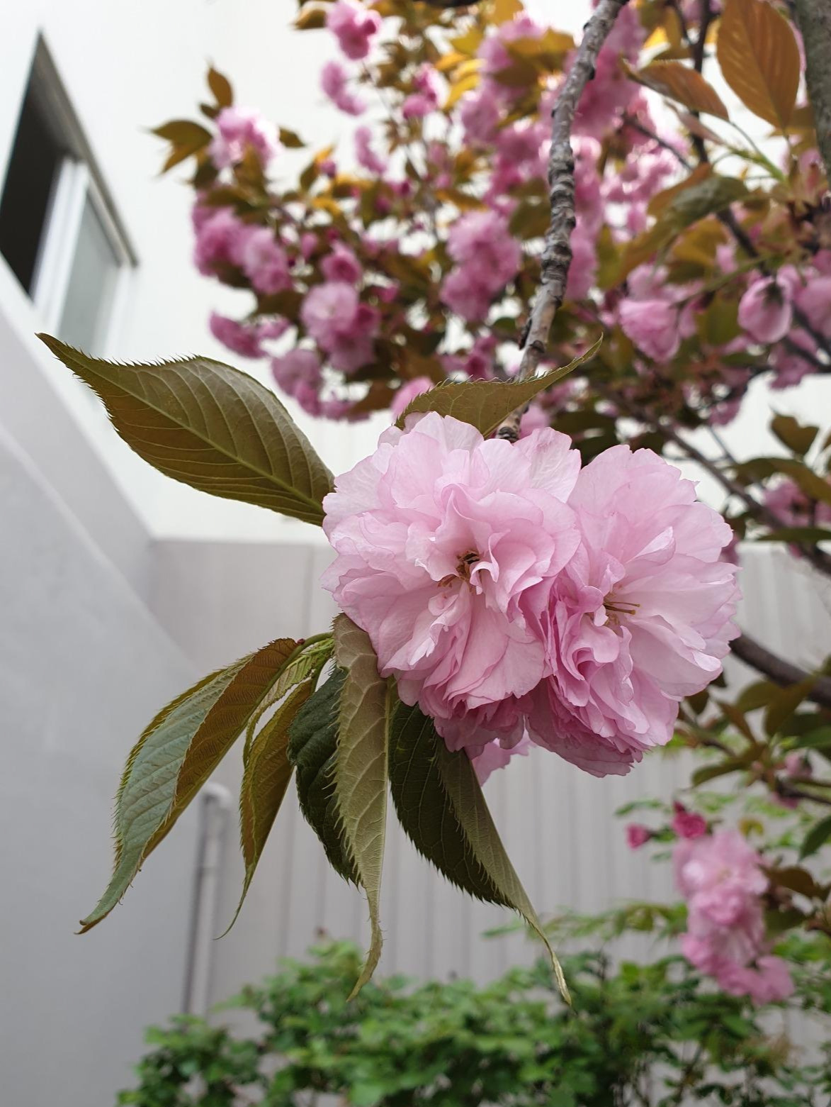 만첩개벚(겹벚꽃). 2019.4.20. 동네에서 촬영 (함께 있는 초록색의 작은 잎들은 다른 나무의 잎이다.)