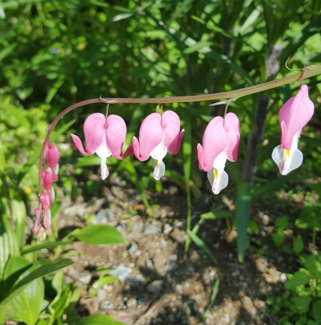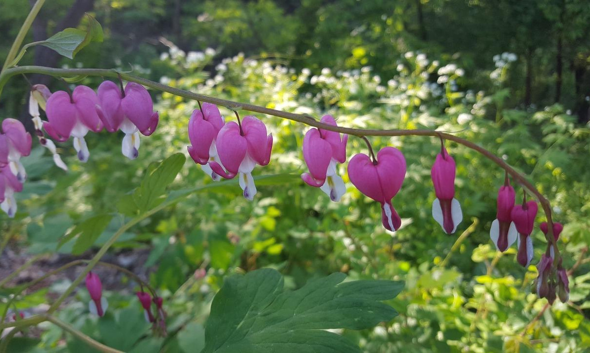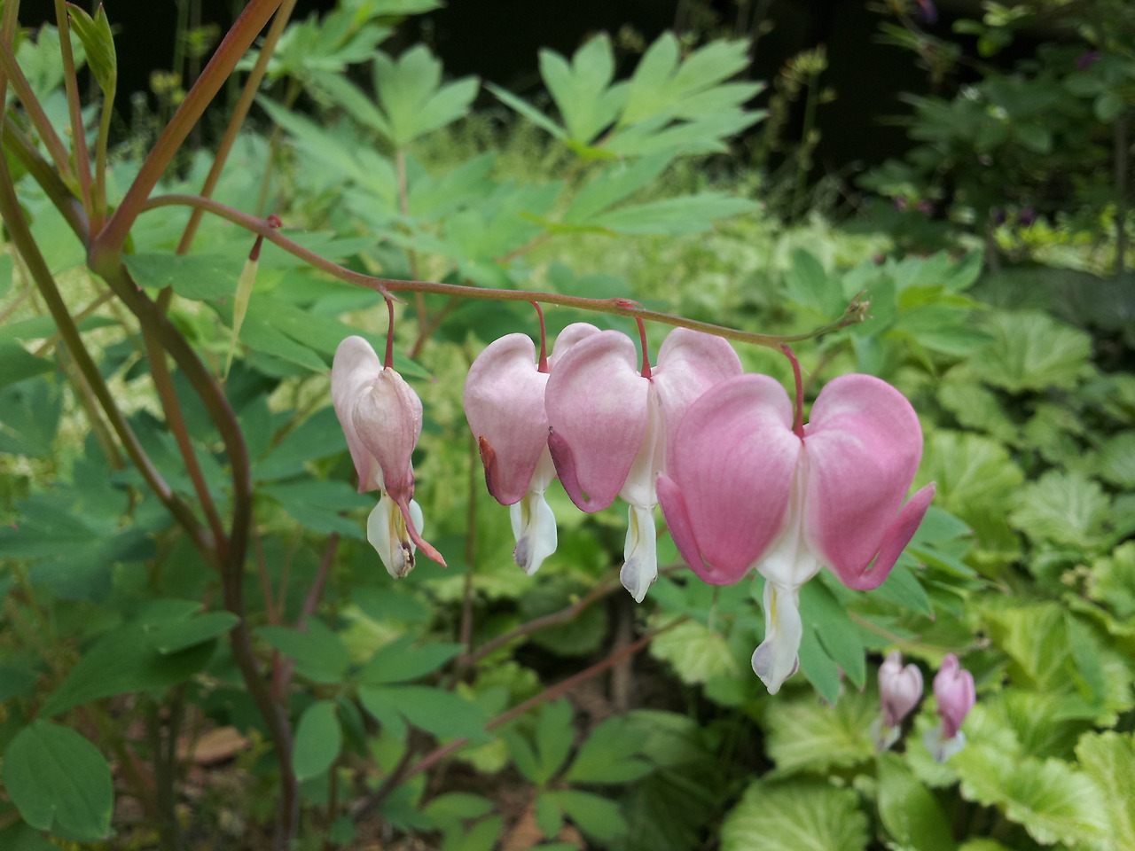 위의 사진을 보면 꽃줄기 오른쪽의 꽃봉오리 모습부터 왼쪽의 꽃잎이 떨어져 해체된 모습까지, 금낭화가 피고 지는 과정을 한눈에 볼 수 있다.