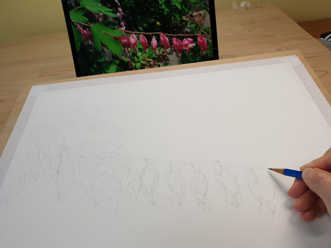 1cm 두께의 나무판(화판)에 물테이프로 배접을 해놓고(5.8, 금) 주말 동안 종이가 충분히 스트레칭 되도록 하고 월요일(5.11)부터 사진을 보면서 아웃라인 스케치를 했다.