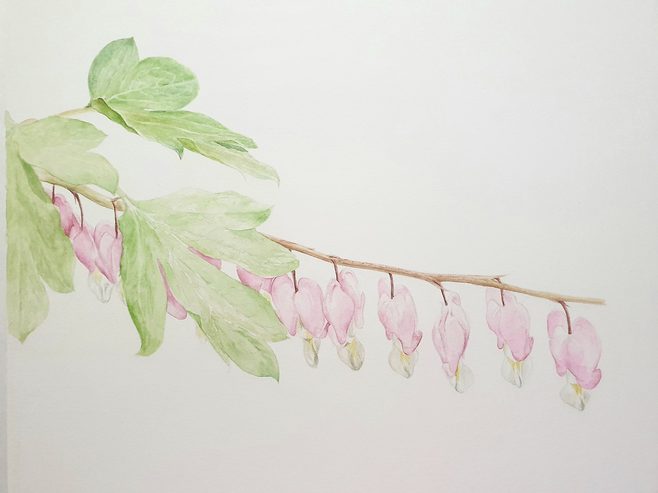 꽃은 잎에 비해 매우 수월하게 진도를 나갈 수 있었다. 꽃잎이 하늘하늘하고 잎처럼 입체감이 없으면서 낱장으로 되어 있는 경우보다 이렇게 금낭화처럼 덩어리로 되어 있는 경우가 그리기가 수월하다. 보통, 꽃잎보다 꽃봉오리가 더 쉽다.