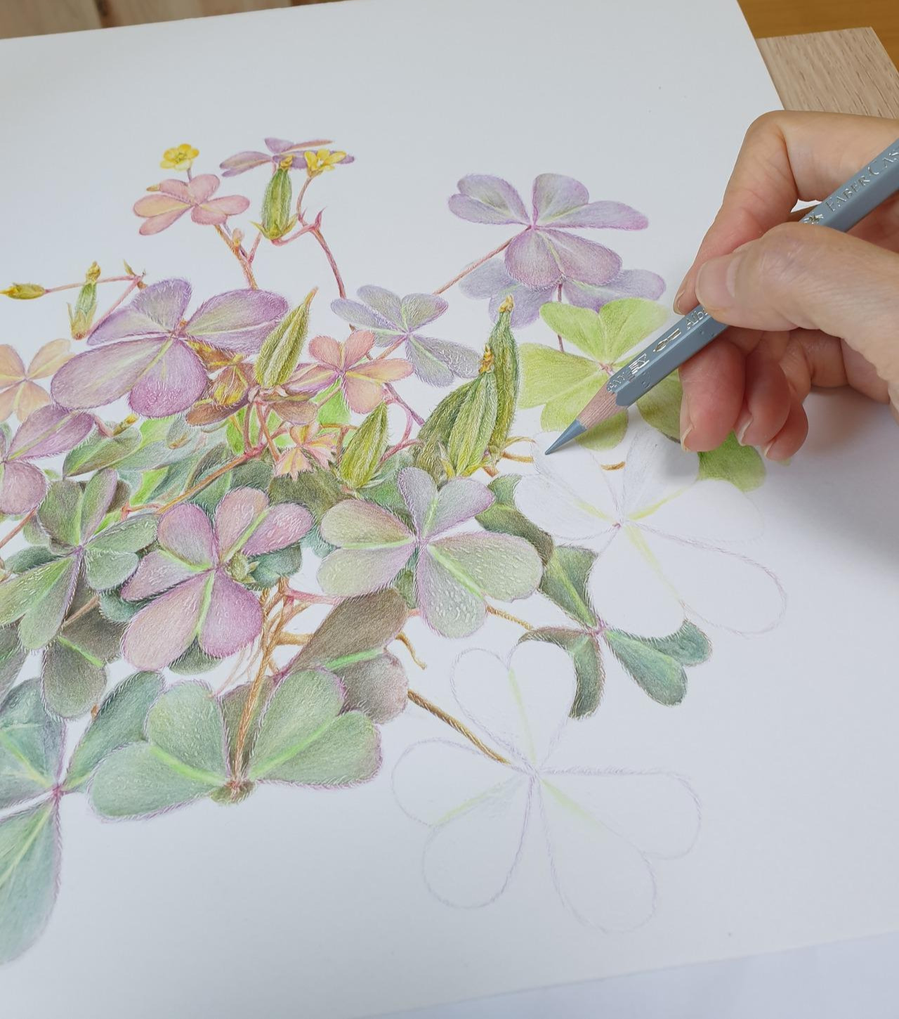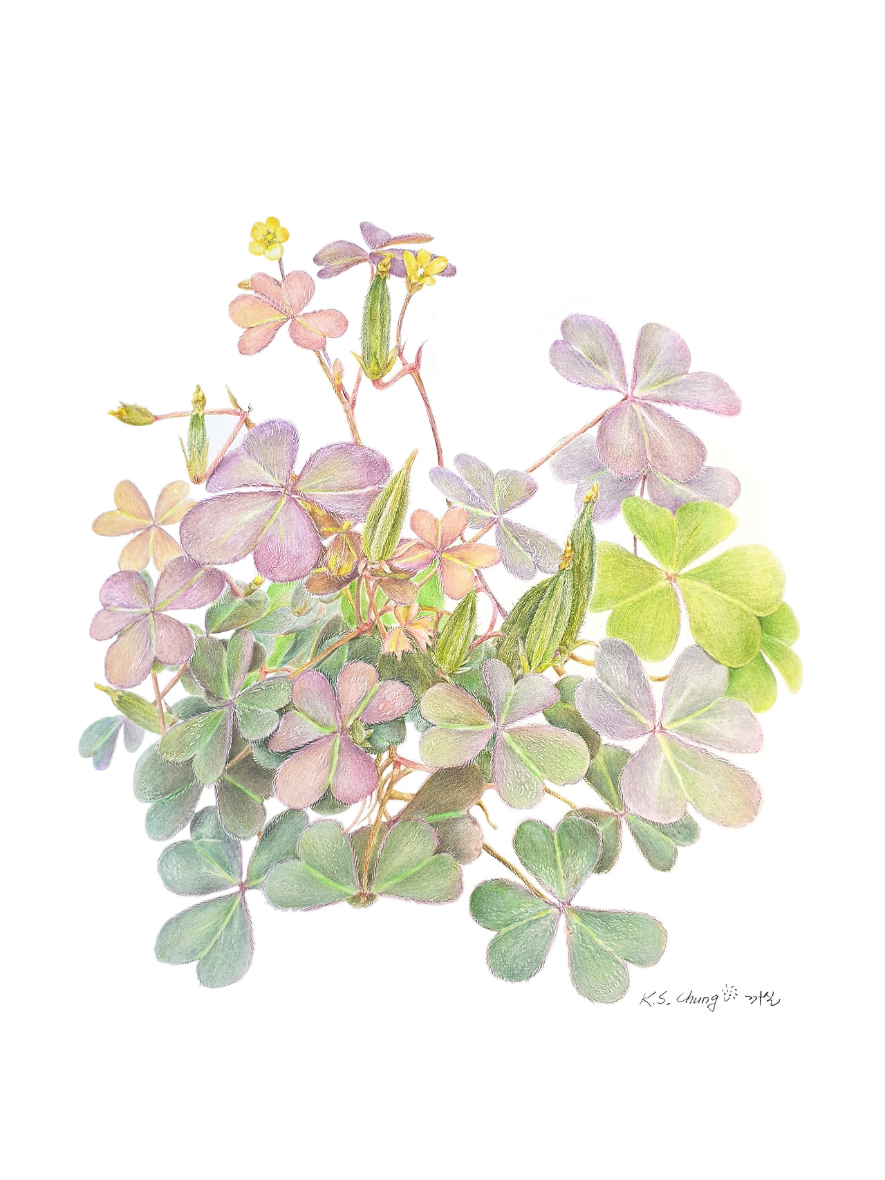 괭이밥은 어릴 때부터 동네에서 흔하게 보아오던 식물이라서 정이 가기도 하고 작고 귀여운 노란 꽃도, 하트 모양의 잎도 예뻐서 그림의 주인공으로 오래전부터 점찍어놓고 있었다. 그래서 길가를 걷다가 보이기만 하면 사진을 찍어두었었다.