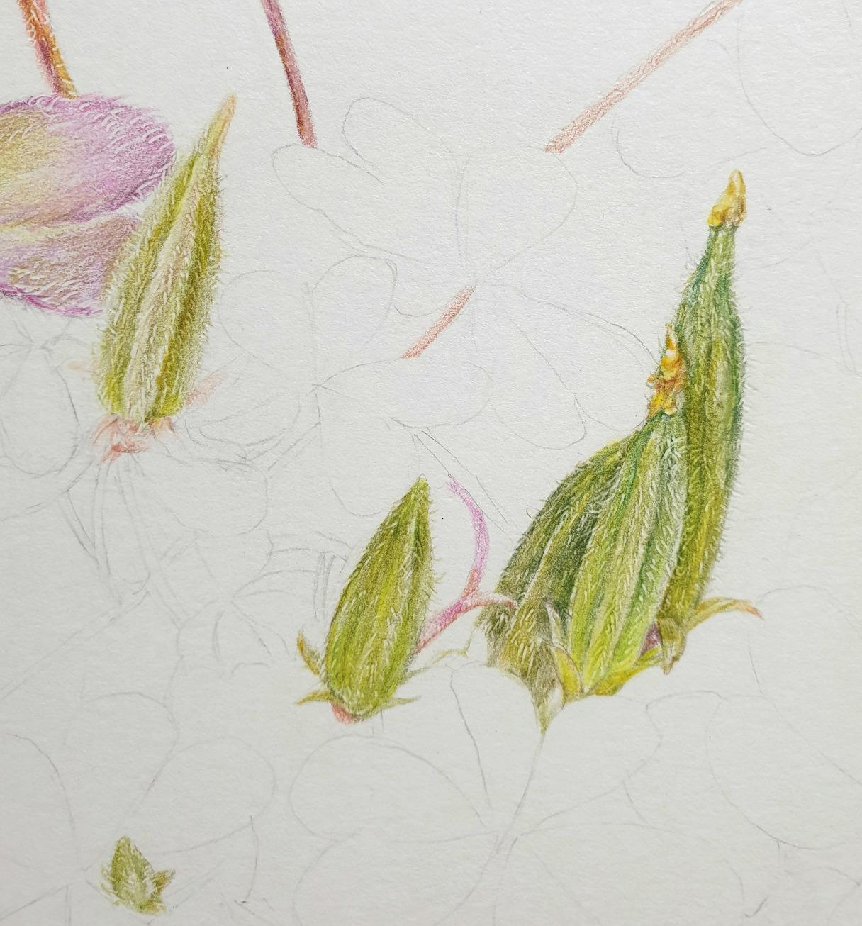 솜털 가득한 씨방은 색연필로 색을 칠하기 전 철펜으로 미리 털 자국을 내놓고 그 위로 색을 칠하면 자국에는 색이 칠해지지 않으면서 자연스럽게 흰 털이 그려진다.