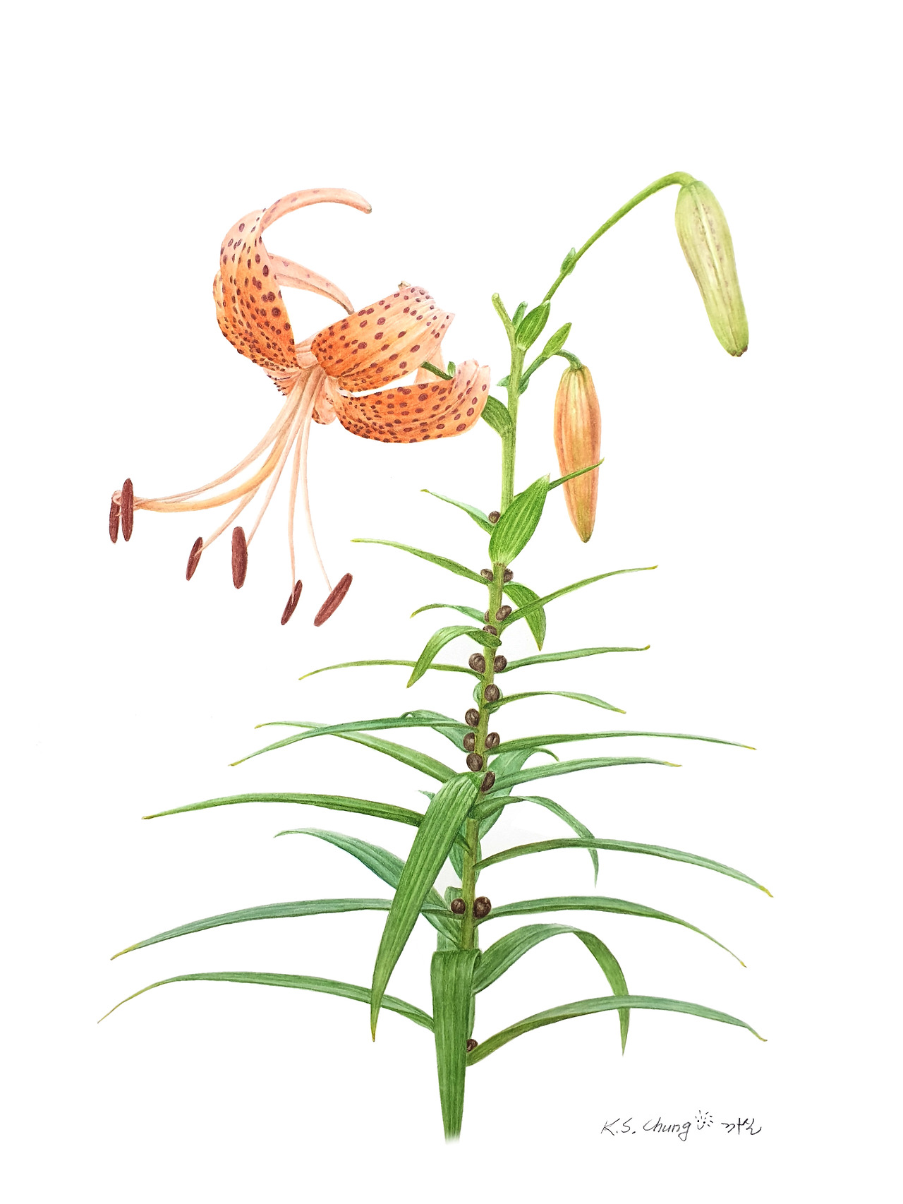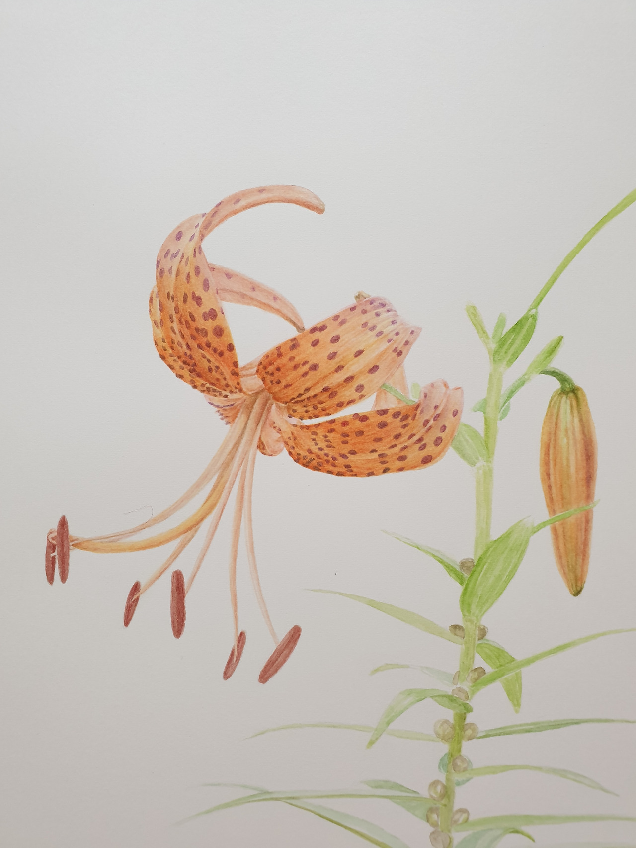 그래서 이번 참나리 그림의 주인공은 가장 안 무섭게 생긴 참나리로 한 송이만 그리기로 했다. 다행히도 어린 연두색 꽃봉오리와 좀 더 성숙한 주황색 꽃봉오리가 함께 있어 허전하지 않고 조화로워 보였다.