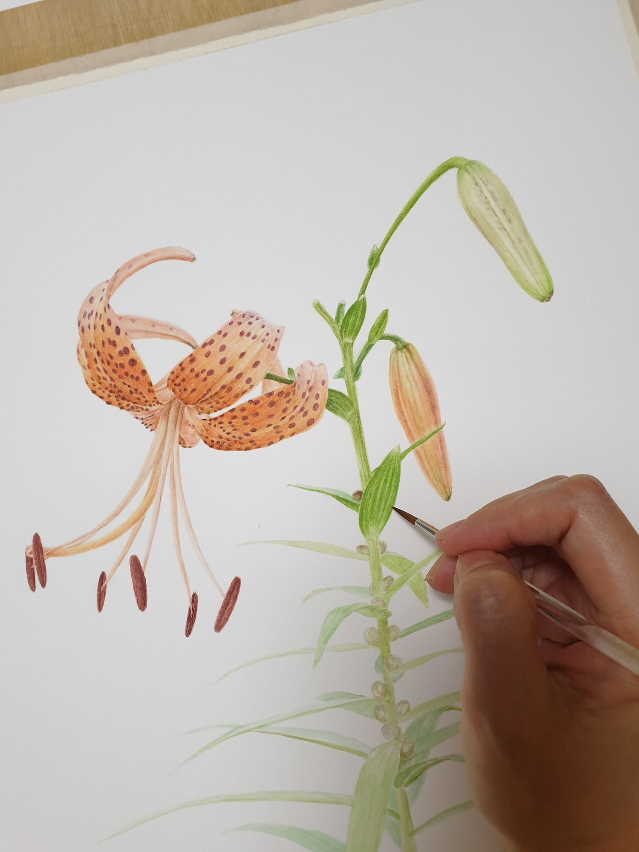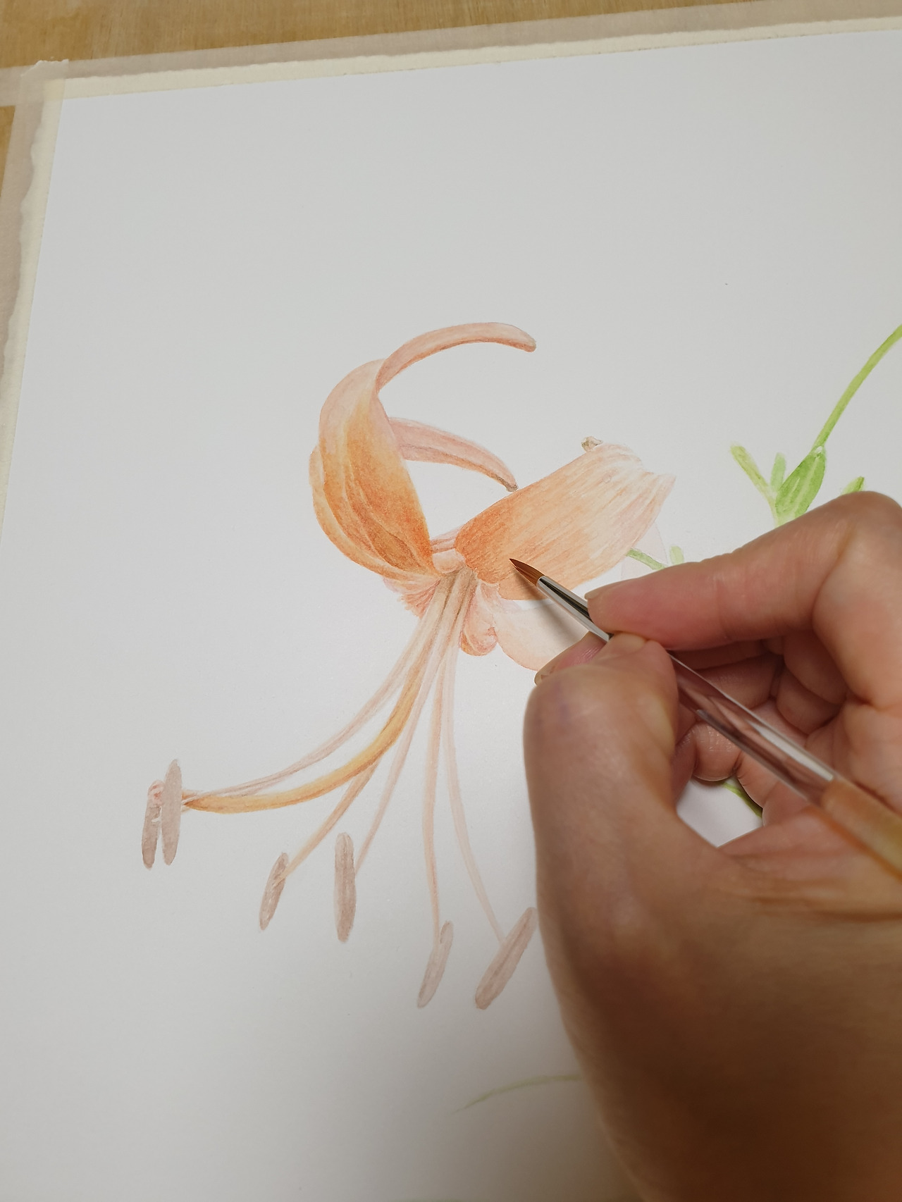 2021.6.28~7.2. 참나리의 주황색 화피 색을 먼저 칠한 후 자주색 점박이 무늬를 그려 넣고 있다. (이후, 무늬와 꽃밥에 색을 몇 차례 더 올렸다.)
