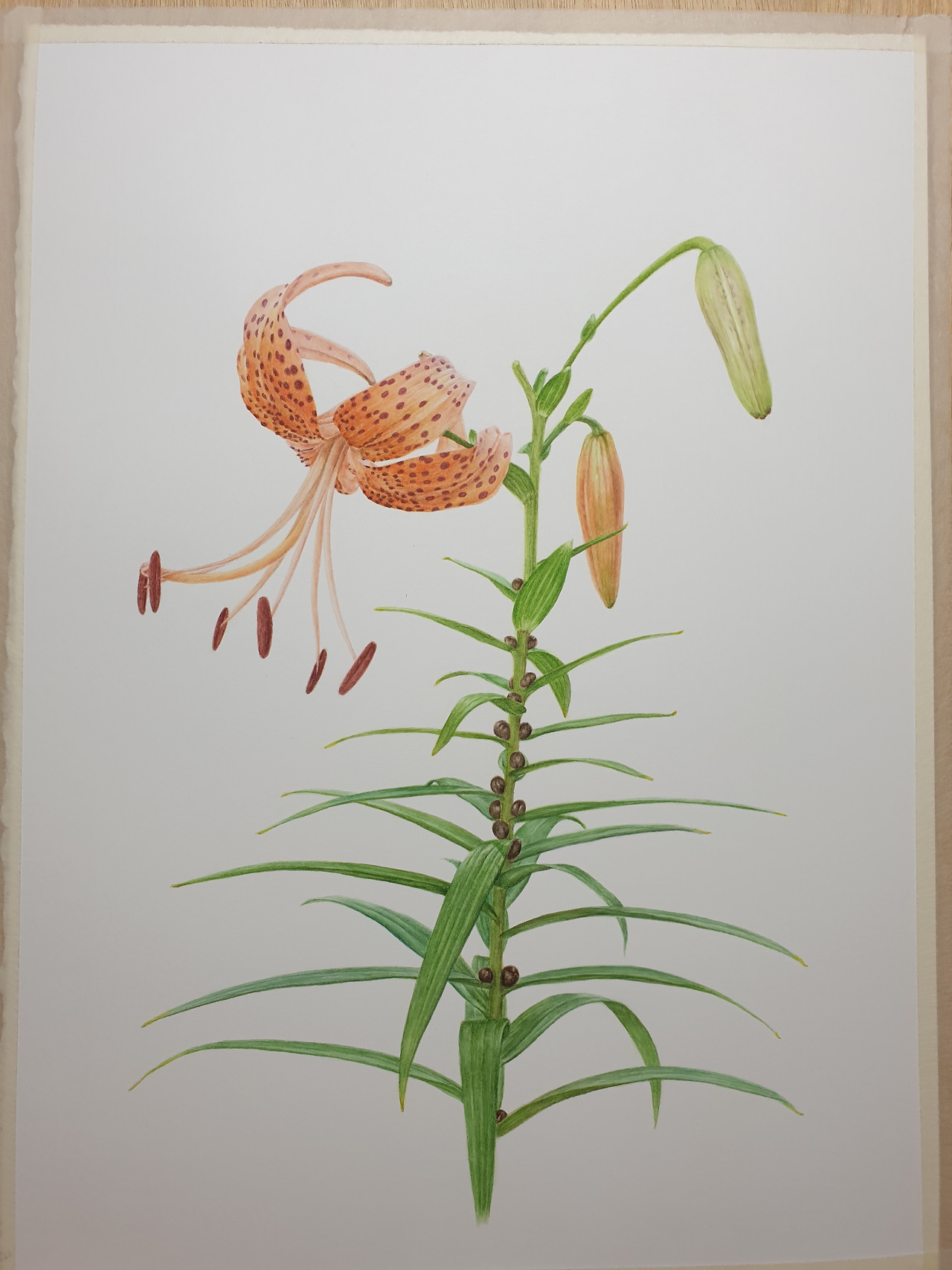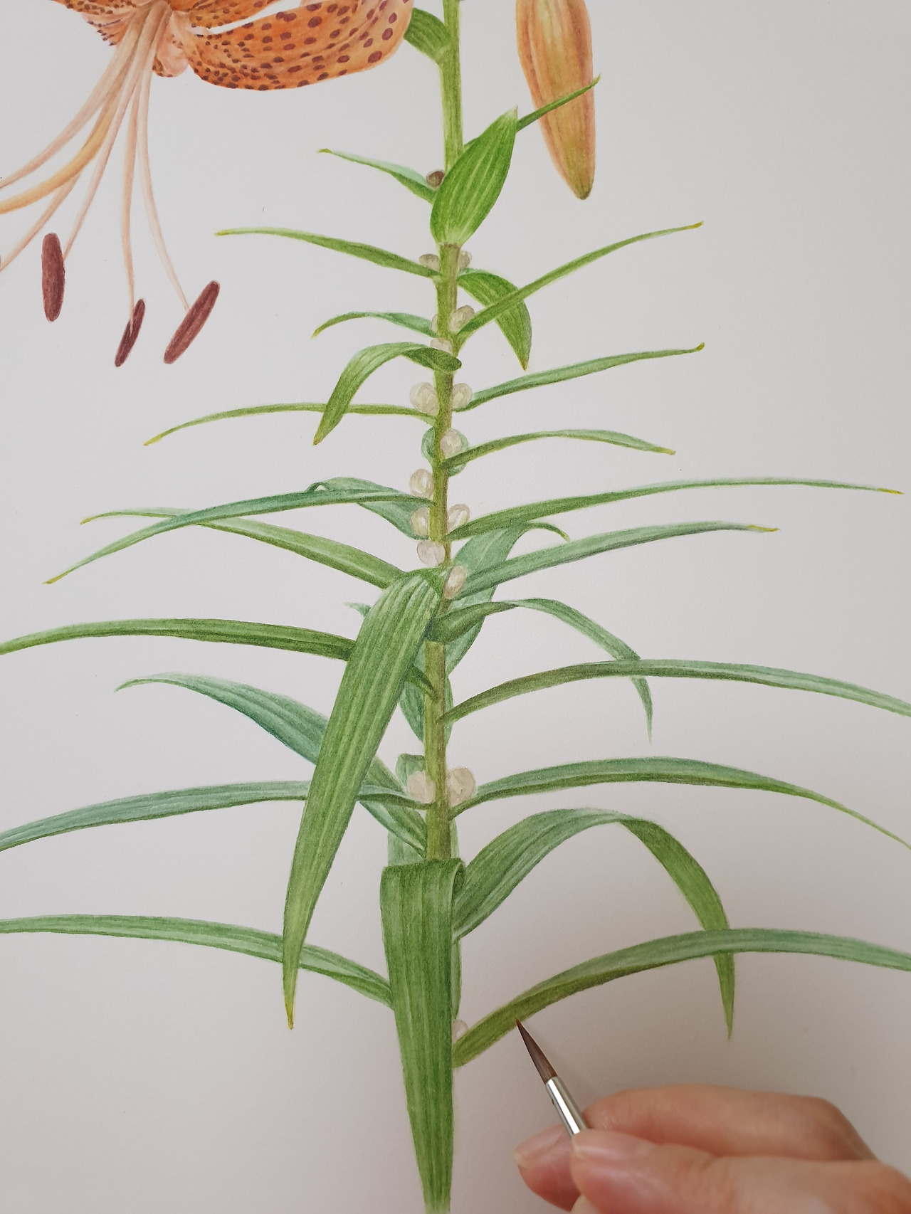 꽃을 다 그린 후에는 잎을 본격적으로 그려나갔다. 쌍떡잎식물의 그물맥 잎을 그릴 때면 한숨부터 나오는데, 나란히맥 잎은 진도가 팍팍 잘 나간다. 그물맥 잎은 그물 같은 잎맥을 먼저 그리고 구획마다 세밀하게 색을 입히고 또 전체의 양감과 음영을 표현해야 하는 수고로움이 있는 반면 참나리와 같은 나란히맥 잎은 붓의 중심만 잘 잡으면 한 번에 색을 쉽게 입힐 수 있고 그라데이션이나 양감의 표현이 비교적 쉽다.