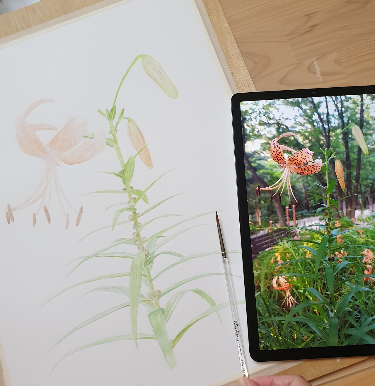 부족한 조명 탓에 어둡게 나온 사진은 컴퓨터로 보정하는 수고로운 과정을 거친다. 이 귀찮은 작업은 그림을 완성했음을 빨리 알리고 싶은 마음보다 항상 뒤로 밀려 인스타그램에는 보정 전의 사진으로 올릴 때가 많다. 이번 참나리도 그랬다. 오늘도 참을성이 없음을 후회하면서 Good bye, 참나리~