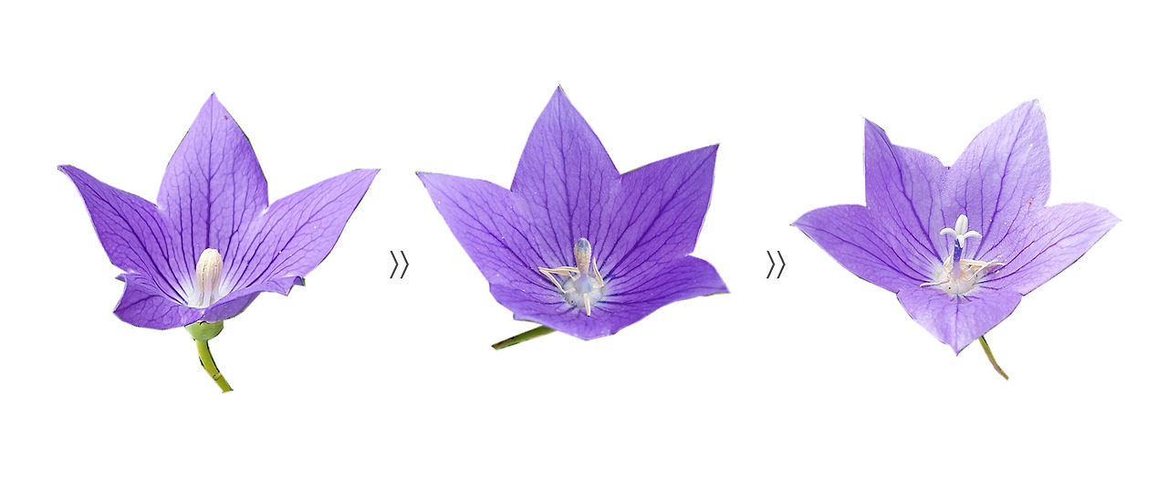 도라지 꽃의 암술과 수술의 변화 (1) >> (2) >> (3) (클릭한 후 확대해 보세요.)