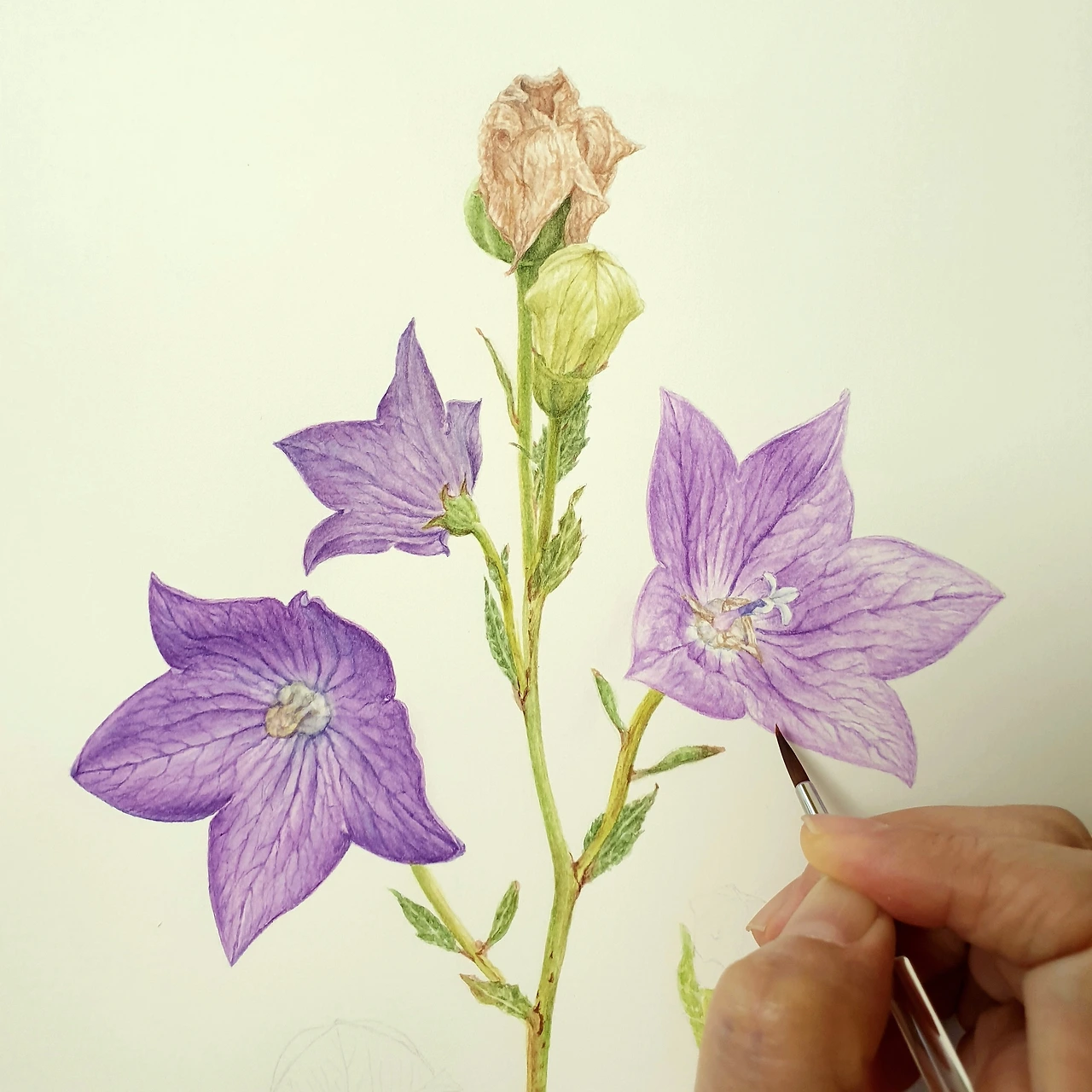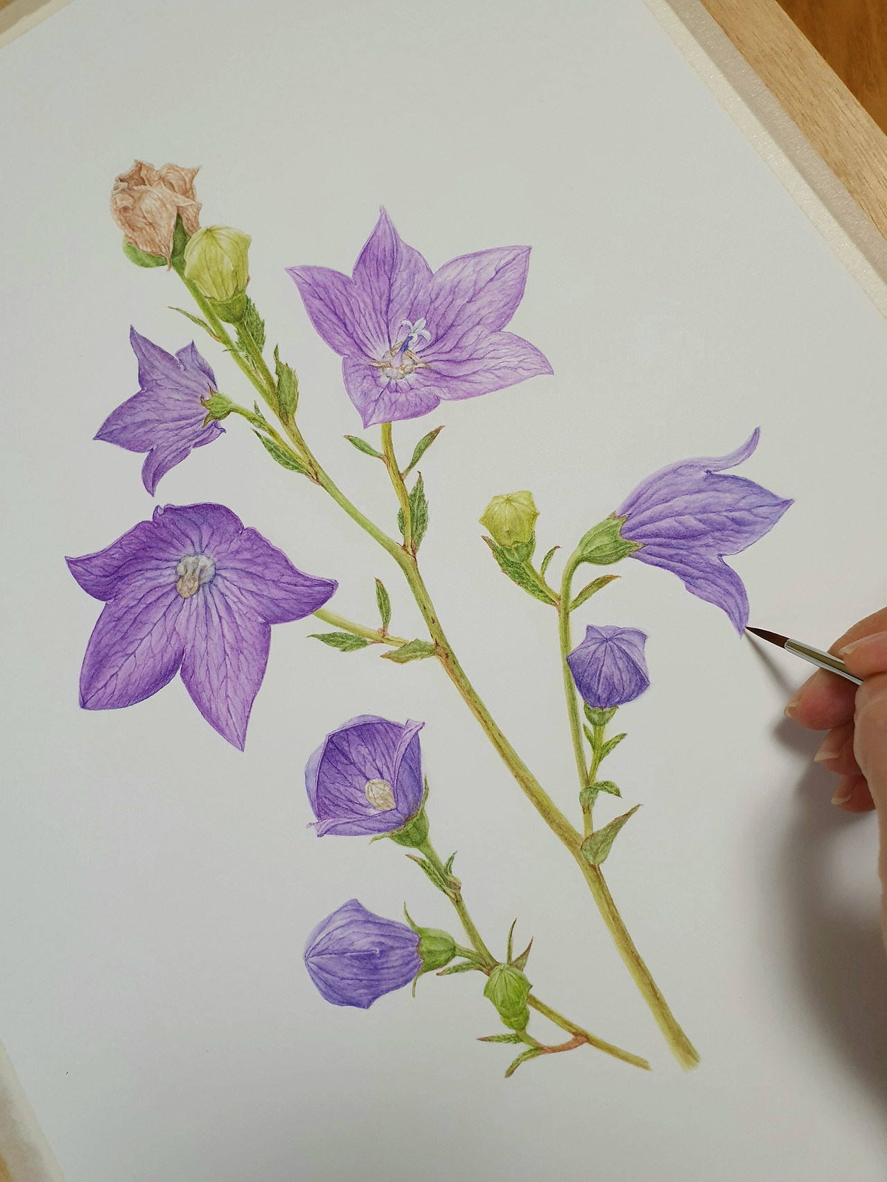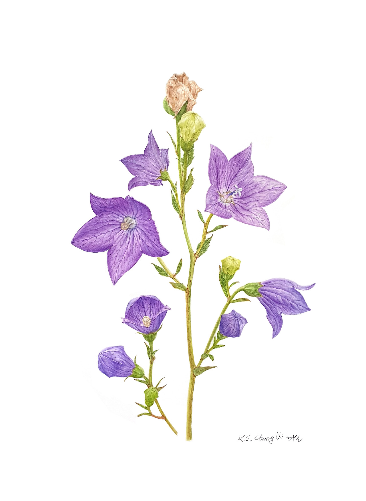 이번에 처음 알게 된 사실인데, 도라지는 동아시아(우리나라, 중국, 일본, 러시아)에서만 자생한다고 한다. 그러고 보니 인스타그램에서 도라지 꽃을 그리는 우리나라 아티스트는 봤지만 외국인은 못 본 것 같다. 꽃봉오리가 풍선 같다고 하여 balloon-flower라는 영문명이 있지만 아마도 서양인들에게는 낯선 꽃일 듯하다.