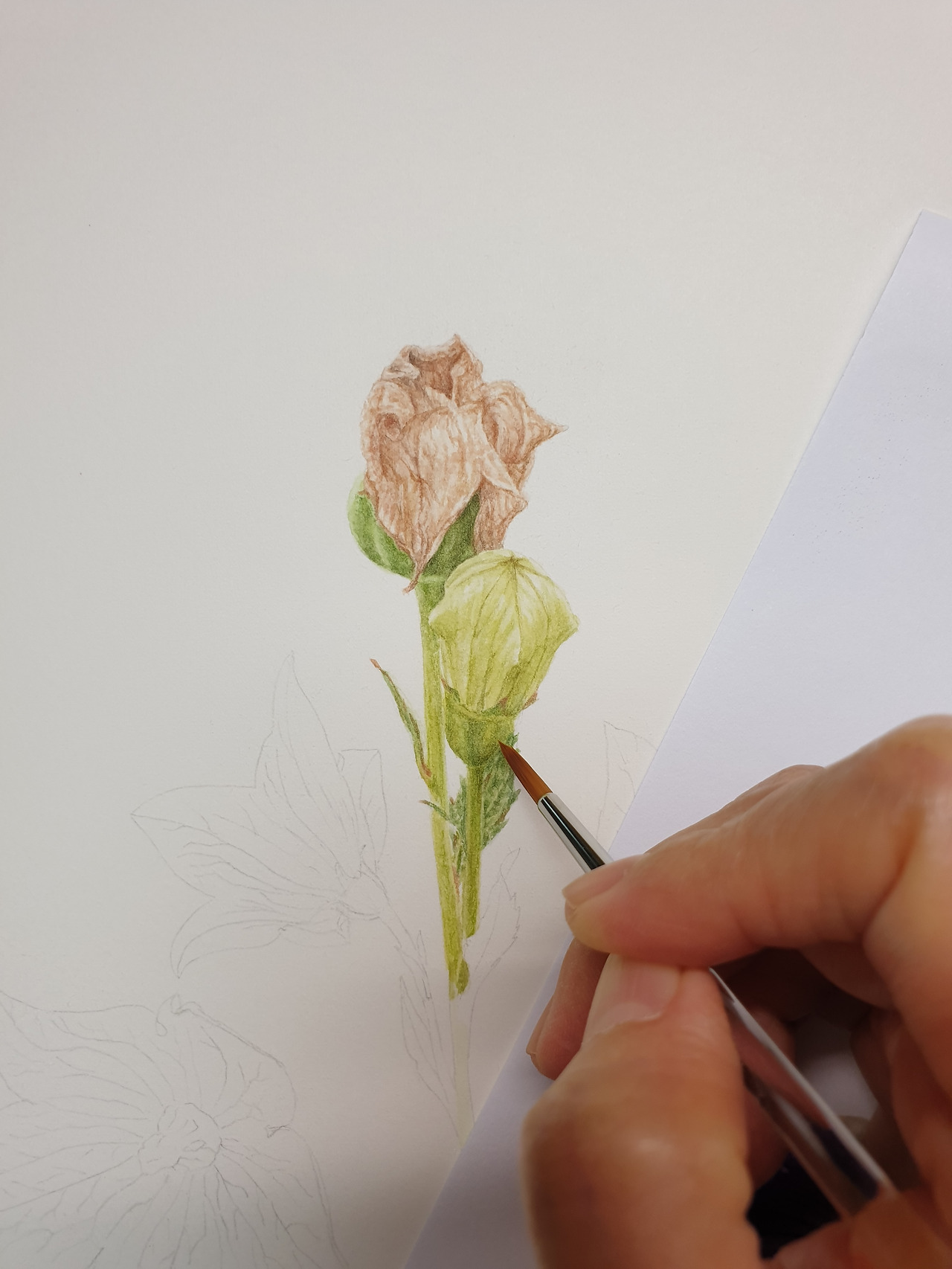 암술과 수술의 변화과정은 일부 넣지 못했지만 도라지 꽃의 일생을 그림에 최대한 담으려고 애썼다. 연둣빛 아기 봉오리가 풍선 같은 보랏빛 청년 봉오리가 되고 또 그 봉오리가 벌어지기 시작해서 종처럼 고개를 숙이다가 활짝 피어나는 모습을 담았고, 예쁘지는 않지만 꽃잎이 갈색으로 시들고 씨방이 커져 통통해진 모습까지 이번에는 제대로 보태니컬 아트로서의 작품 욕심을 내 보았다.