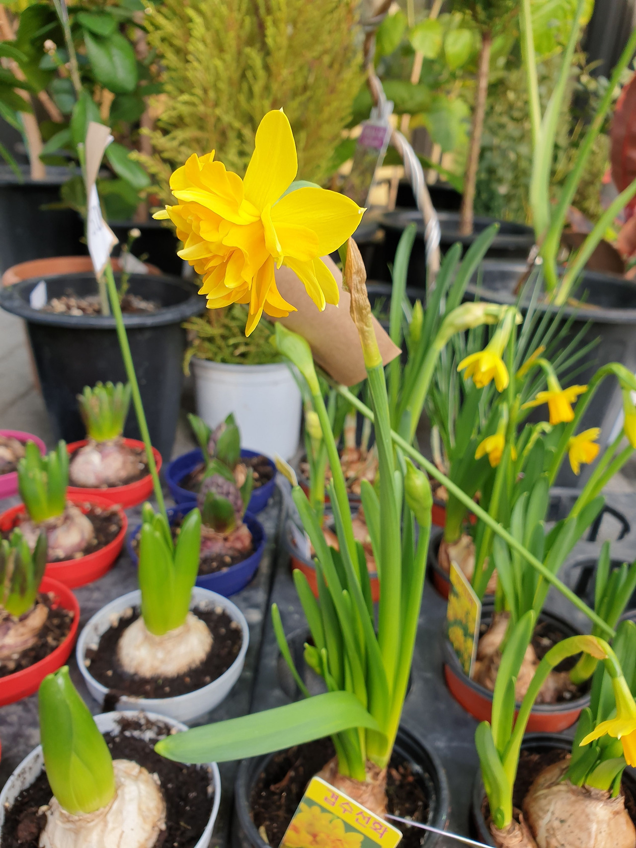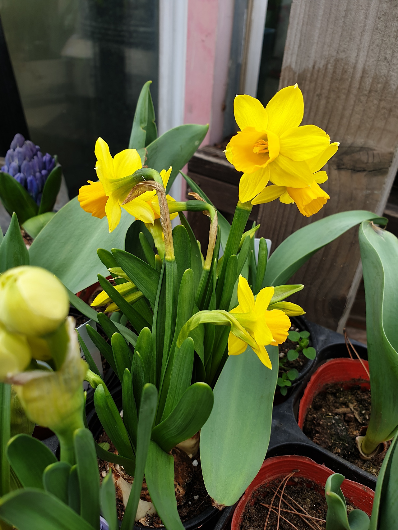 애기수선화와 겹수선화 (수선화 왼쪽으로 히아신스가 보인다.). 2022.2.18. 동네 꽃집에서
