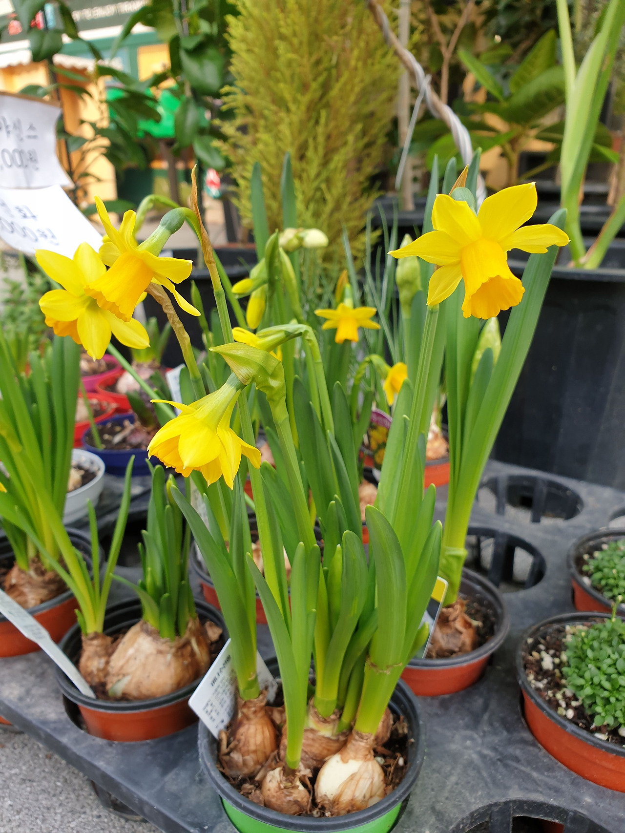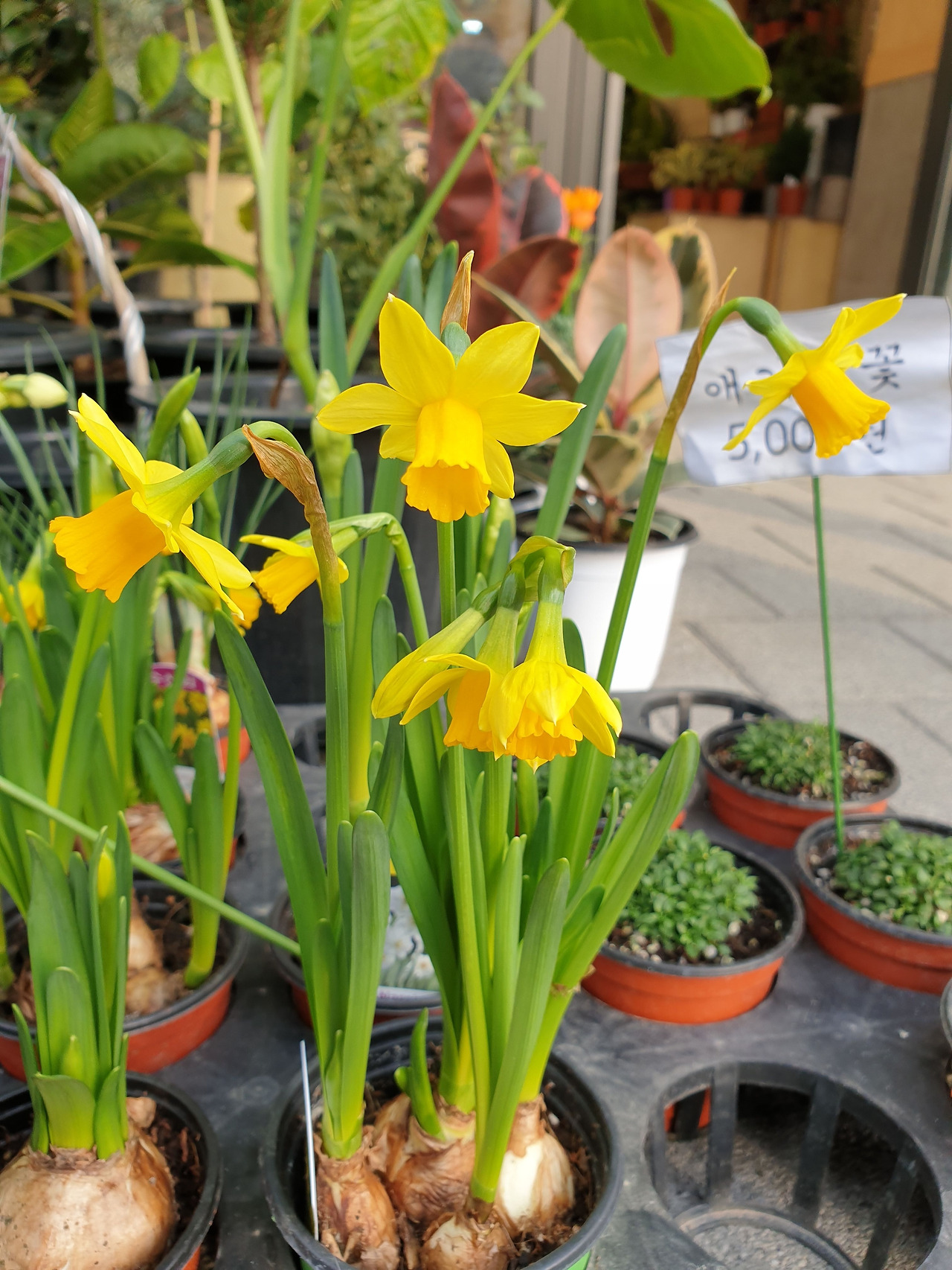 수선화(뒤로 보라색 히아신스도 보인다.). 2019.3.19. 동네 화원에서.