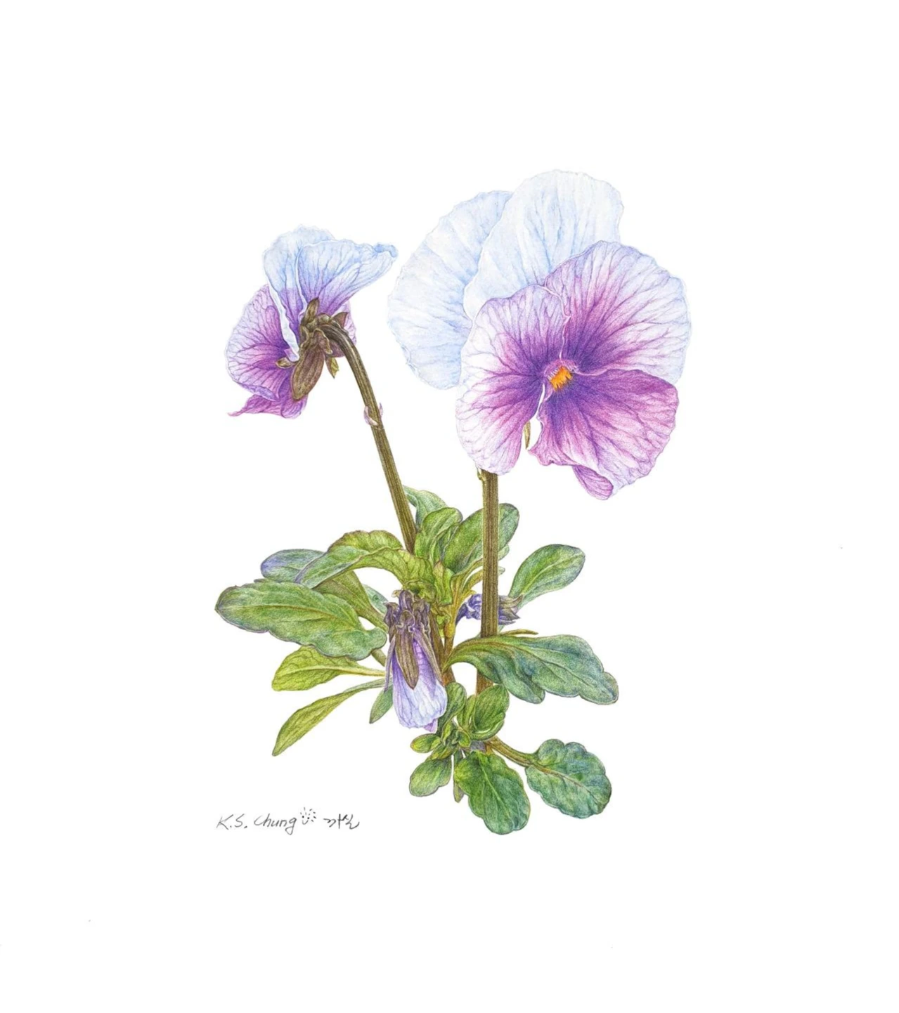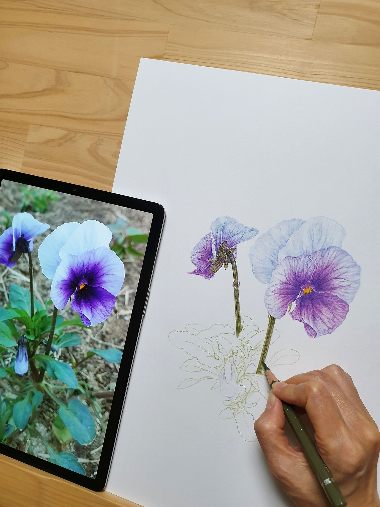 이번 그림은 올해(2022년) 4월 초에 동네에서 만난 팬지이다. 화려하지 않으면서 귀엽고 단아해서 많은 팬지 사진들을 제쳐두고 선택했다.