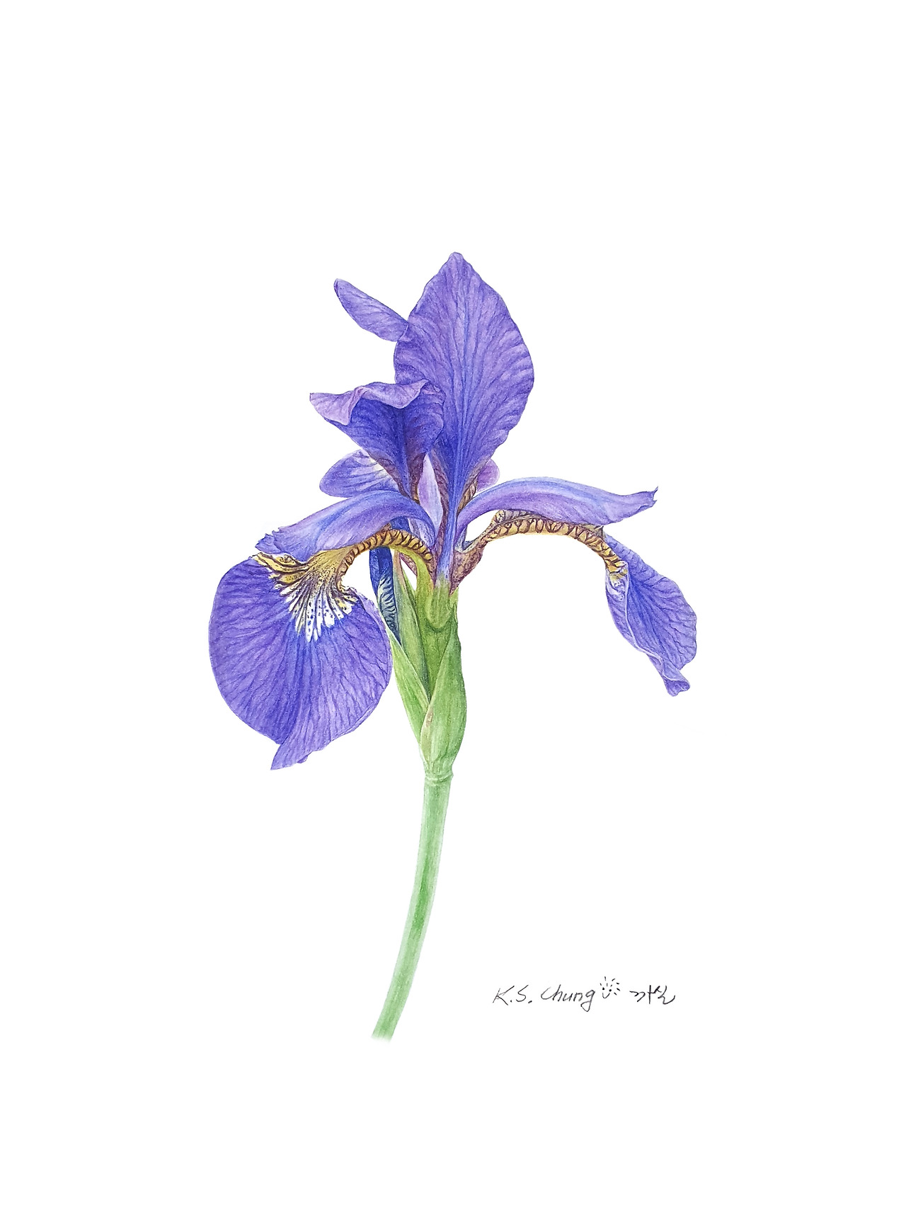 보통, 한 달의 1/3은 소재를 선택하느라 흘려보내고 10일 정도가 되면 '동네꽃' 그림 작업을 시작하는데 이번 5월은 연휴이자 가정의 달이고 코로나19에서도 어느 정도 해방된 터라 좀 멀리 여행도 가고 가족들과의 모임을 많이 가지게 되어 한 달의 3/2를 흘려보낸 후에 작업을 시작해야 했다. 그래서 비교적 손이 덜 가는 소재를 고르려고 마음먹었는데 이 붓꽃이 눈에 딱 들어왔다. 꽃은 한 송이만, 잎은 없는 그런 꽃. 딱이었다!
