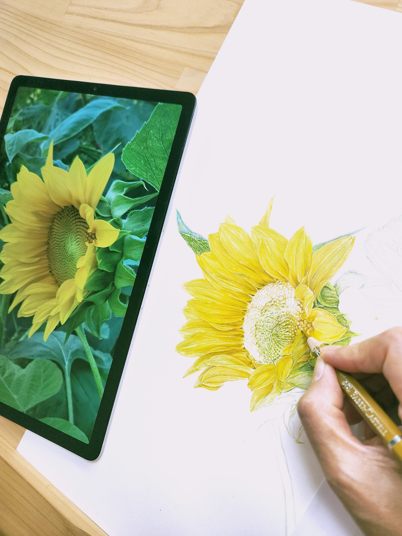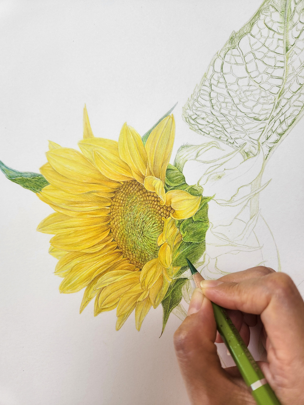 해바라기 관상화 부분을 다 그리고 나서 가뿐한 마음으로 꽃받침을 그리고 있는 모습. 2022.7.27