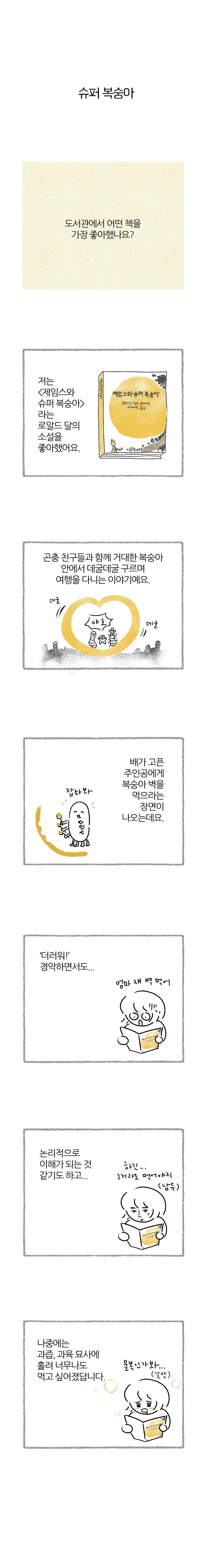 복숭아는 주로 요플레에서나 먹는 편이지만...(귤 오렌지 자몽에 주력하는 편) 복숭아를 먹거나 볼 때면 항상 로알드 달의 <제임스와 슈퍼 복숭아>가 생각납니다. 어릴 적 자주 읽은 책인데도 커다란 복숭아 외에는 내용이 가물가물하네요. 지금 다시 본다면 처음 읽는 책처럼 읽어볼 수 있겠어요!