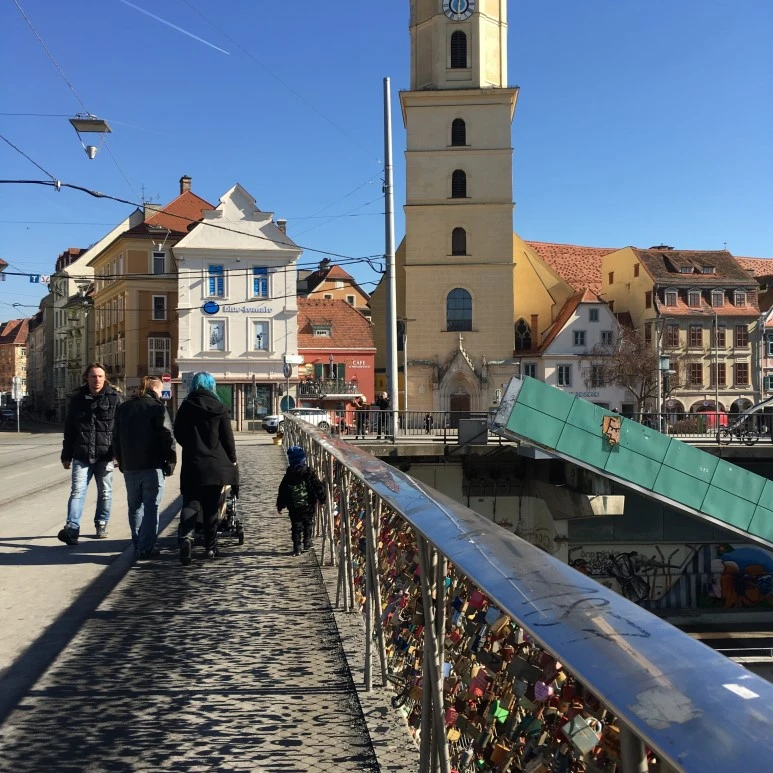 강넘어로 여태껏 내 눈으로 보지 못했던 광경이 펼쳐졌는데. 햇빛이 강하게 쬐서 더 아름답게 그 모습을 보여주고 있었다. 도시를 관통하는 Mur강 다리에는 이뤄졌던 사랑의 증표들이 잔뜩 걸려져있었다. 안타깝지만, 저 중에는 끝내 마음을 같이 채울수 없었던 자물쇠도 많으리라 생각한다.