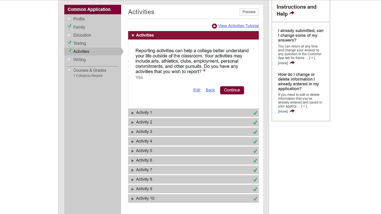 한국의 학생부 종합 같은 수시 전형에서도 여러 활동을 적어 내긴 하지만, 미국에서 비교과 활동의 중요성은 비교할 수 없다. 교내 클럽 활동 및 대회 참여에서 연구 활동, 여름 캠프, 인턴십 및 세계 대회까지 미국 학생들은 다양한 부분에서 치열하게 '교과외 활동'에 매진하고, 굵직한 경력과 전공/관심 분야에 연결되는 활동들은 더욱 더 대입에도 영향을 미친다. 하지만 대표적인 대회나 활동 외에도 자신이 하고 싶어서 시작했던 일이라면 어떤 것이든 이 Activities에 해당될 수 있기 때문에, 학생마다 매우 다른 그림이 나올 수 있다.