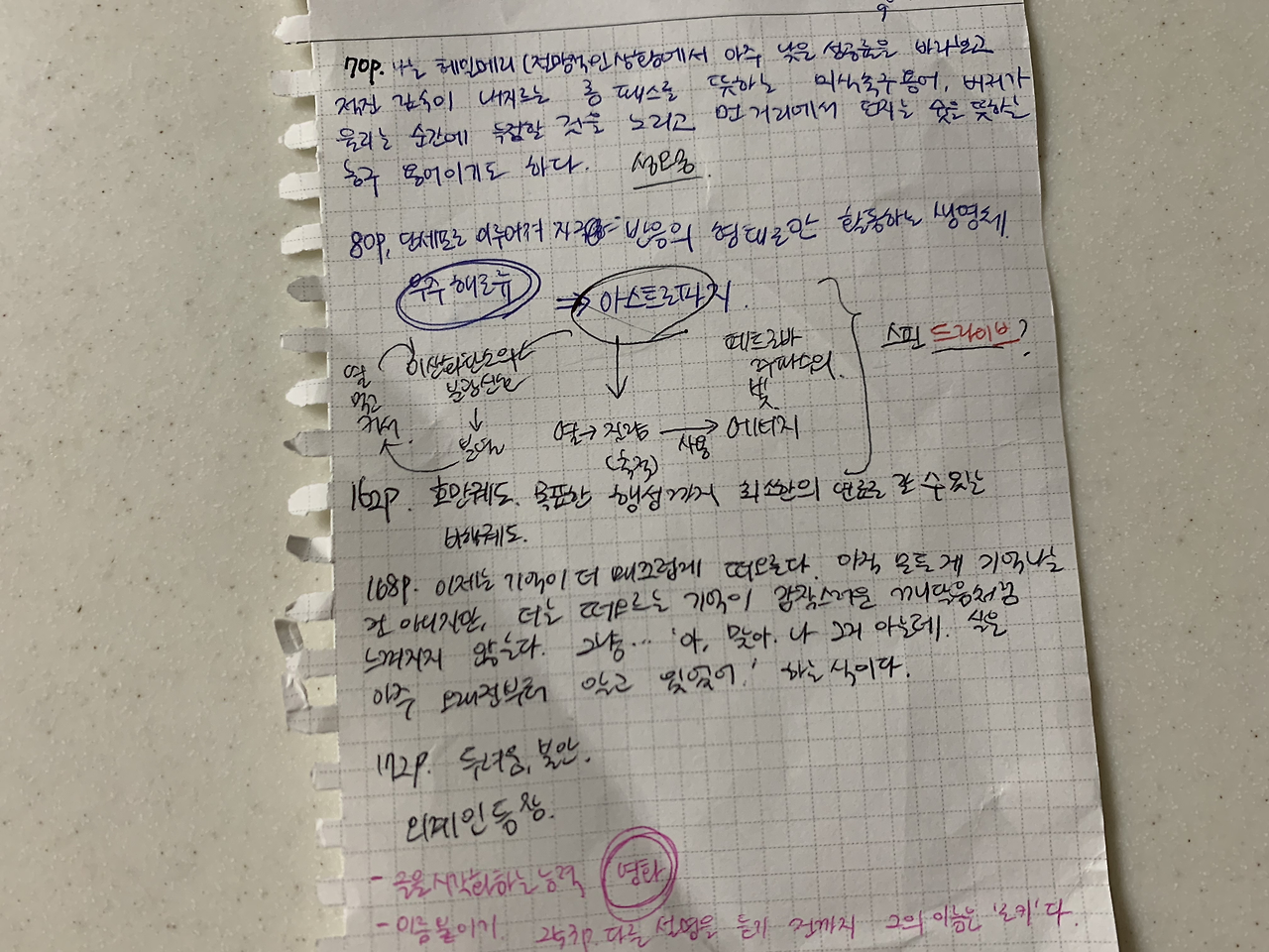 순수 100% 문과체질인 나는 개인적으로 이 책을 읽으면서 끝없는 문제집을 푸는 느낌이었다. 아스트로파지의 생태 주기를 애써 정리하고 나면 아스트로파지의 열 변환에 관해 알아야 하고, 우주선의 운항 방법, 질량과 무게의 관계, 로키의 숫자와 언어 체계, 로키가 살고 있는 행성의 시간과 중력, 행성 간 시간과 중력의 비교, 단위 변환, 행성과 항성, 지구의 공전과 자전, 태양과 금성 등 기본적인 과학 지식뿐만 아니라 작가가 만들어낸 세계, 그 세계와 실제 지구와의 공식 변환 등 내가 이 책을 제대로 이해하기 위해서는 엄청난 시간을 들여 공부하고 정리를 해야 한다.